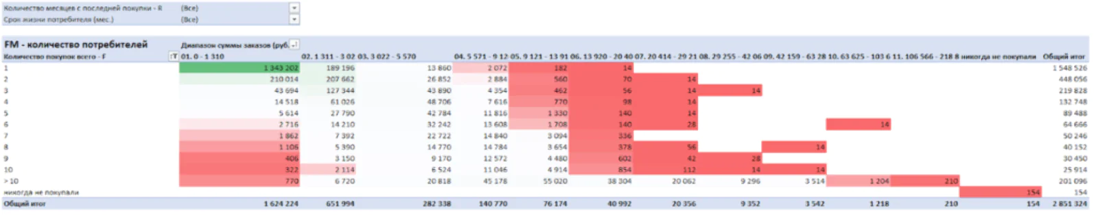 RFM-отчет — это сводные таблицы, которые показывают распределение людей по действиям: