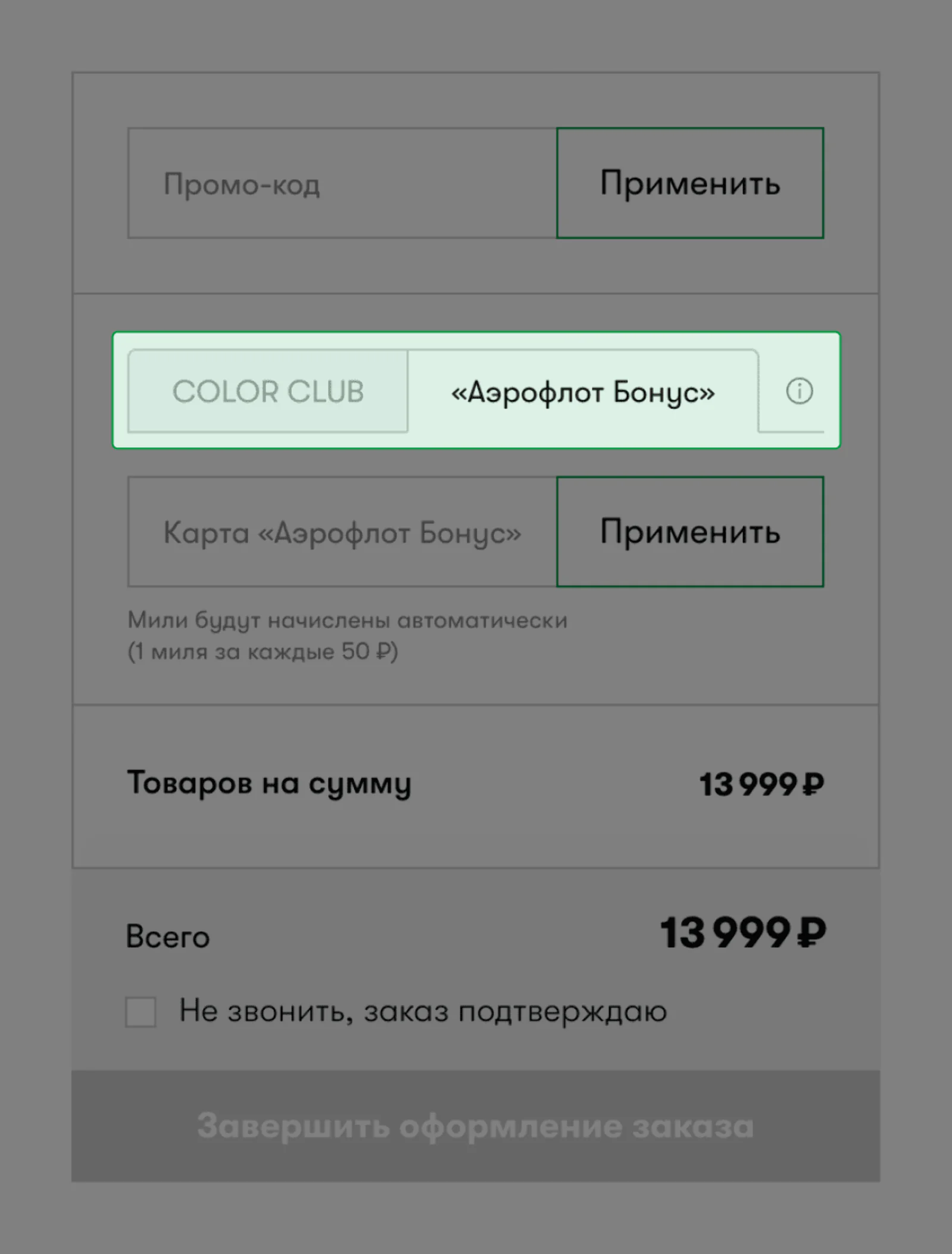 По правилам, клиент не может одновременно списывать баллы «Аэрофлота» и собственной программы лояльности Benetton. Это ограничение учли в платформе — при выборе одной программы лояльности в корзине на сайте вторая становится неактивной: