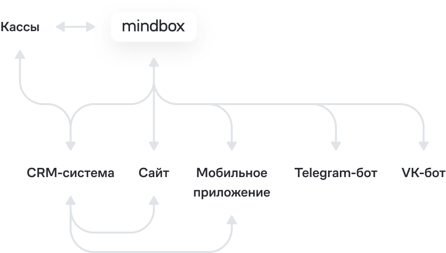 Кассы. Оттуда в Mindbox поступают данные о купленных товарах и их ценах, оформленных картах лояльности. Из CDP на кассы передаются правила начисления и списания бонусов, промокоды участников акций, персональные офферы, актуальный бонусный баланс.