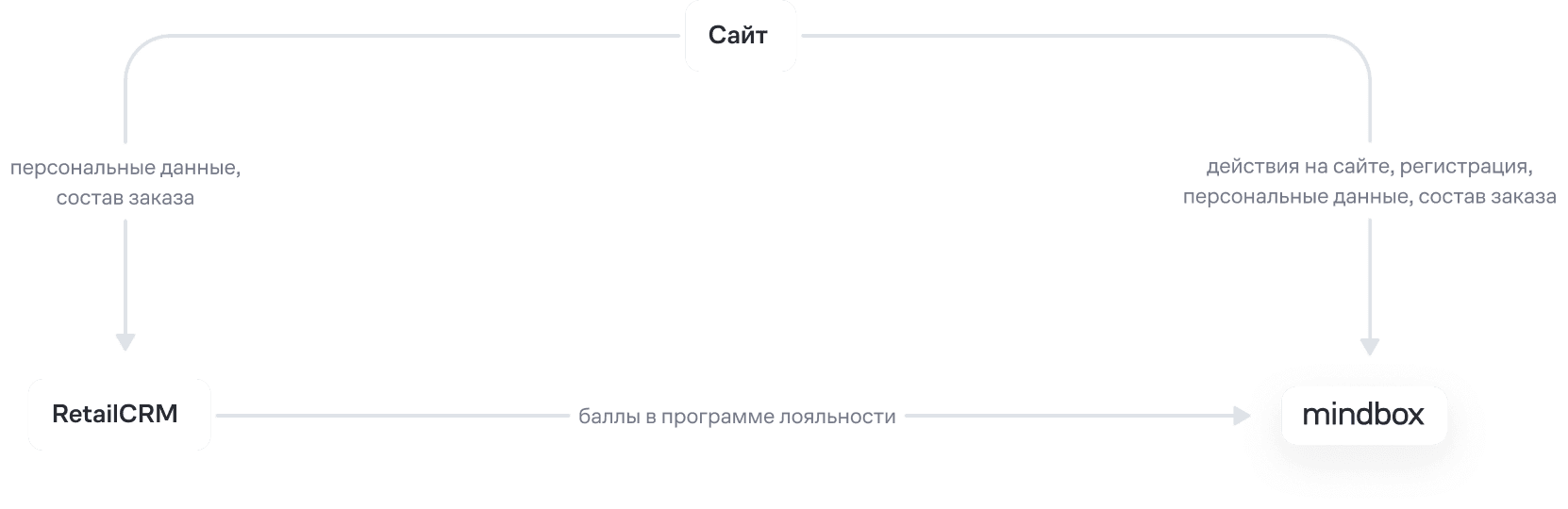 Mindbox получает с сайта информацию о действиях пользователей, а из RetailCRM — о количестве баллов у клиентов