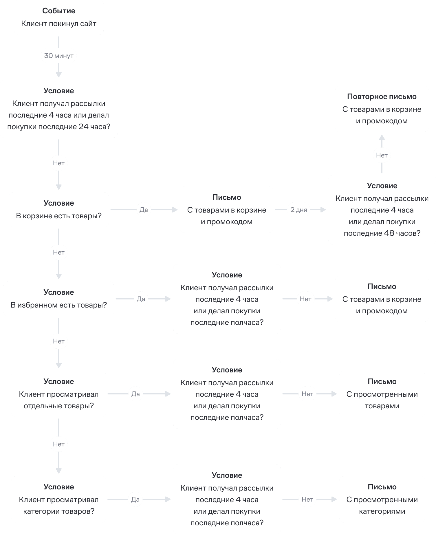 Мотивация на первый и повторный заказы. Письма с промокодом на первый заказ получают клиенты, которые оставили почту на сайте более двух недель назад, смотрели товары, добавляли их в корзину, но ничего не купили. Письмо с промокодом на следующую покупку отправляют не чаще раза в две недели тем клиентам, у которых уже есть доставленный заказ. Если клиенту один заказ доставили сегодня, а второй — завтра, он получит письмо только за сегодняшний заказ.