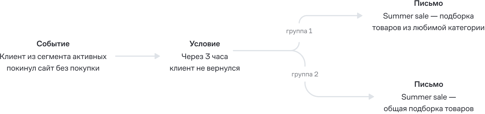 Второй сценарий работал по тому же принципу, что и первый, только вместо распродажи использовали раздел «новинки». В выборку для АВ-теста попали те, кто смотрел новинки и ушел с сайта без покупки, при этом у всех было заполнено поле «самая просматриваемая категория товаров». Тестовая группа получала письма с новинками из категории, которую они чаще всего смотрели на сайте, а контрольная — общую подборку случайных товаров из раздела «новинки».
