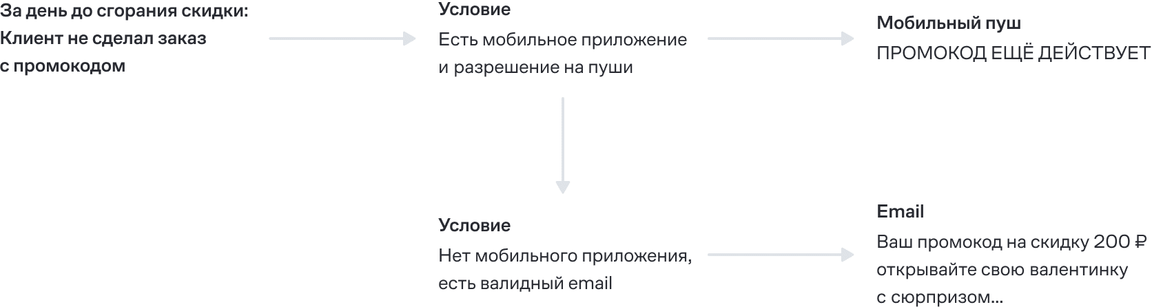 Тем, кто не воспользовался скидкой, напоминали о ней за день до ее сгорания. Для этого отправляли каскадную рассылку: мобильный пуш и email.