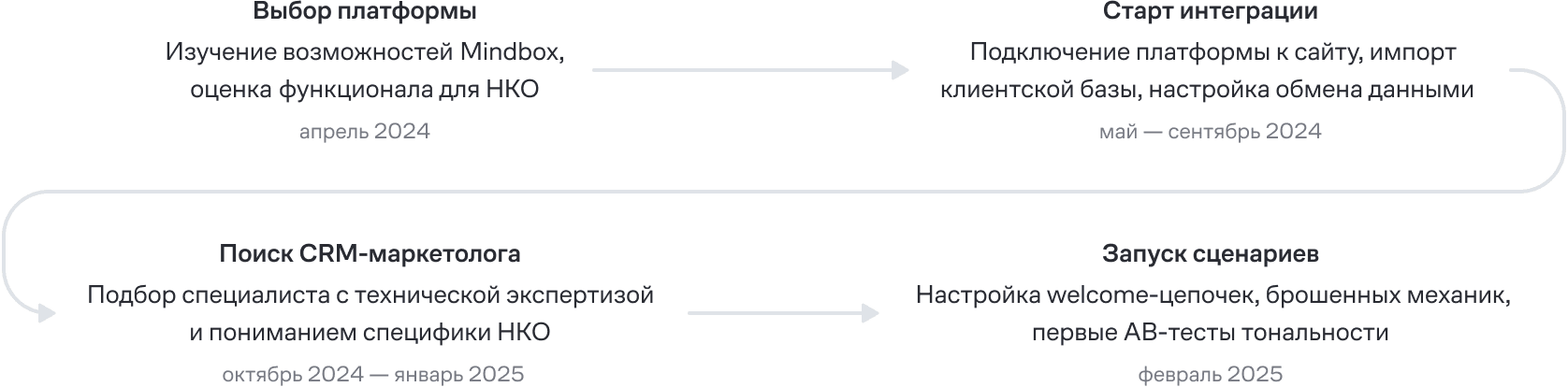 Переломным моментом стал вебинар коллег из фонда «АиФ.Доброе сердце». На нем рассказывали, как Mindbox помогает НКО выстраивать коммуникации с донорами: собирать единый профиль благотворителя, настраивать сценарии и отслеживать результаты. Потом мы подробно изучили возможности платформы и убедились, что она подходит для задач фонда.