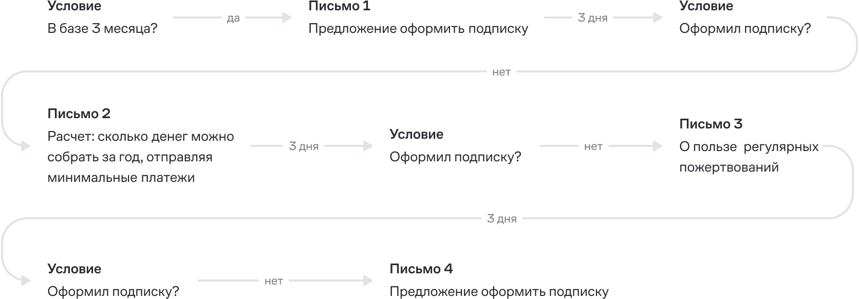 Клиентам, которые уже три месяца в базе, отправляют цепочку писем о том, что можно оформить регулярный платеж — автоматическое ежемесячное пожертвование от 10 рублей. Средняя конверсия в пожертвование — 0,15%.