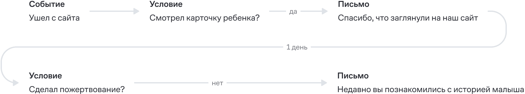 Команде потребовалось время, чтобы продумать логику сценариев и архитектуру интеграции с учетом специфики благотворительного фонда. Например, механика «брошенный просмотр» срабатывает, когда человек открыл страницу сбора и прочитал историю, но пока не сделал пожертвование. Нужно было настроить сценарии, чтобы они работали корректно для задач фонда.