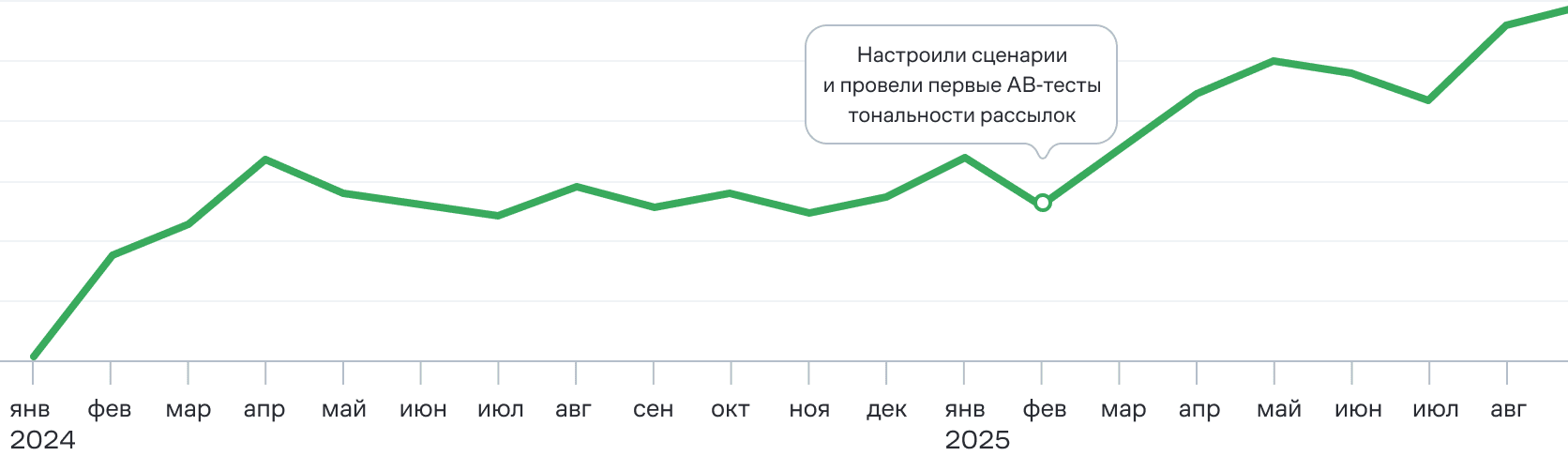 С апреля 2024 по март 2025 года подключали платформу к сайту, импортировали клиентскую базу, настраивали обмен данными с внутренними системами. Параллельно разрабатывали триггерные механики и писали тексты для автоматических цепочек.