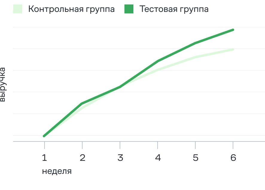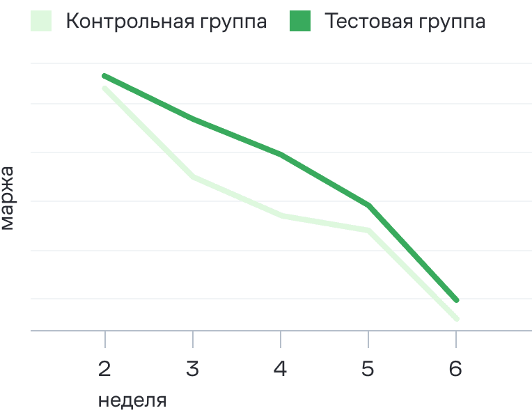 За 6 недель выручка в тестовой группе выросла на 23% по сравнению с контрольной, а маржинальность — на 0,8 п. п.