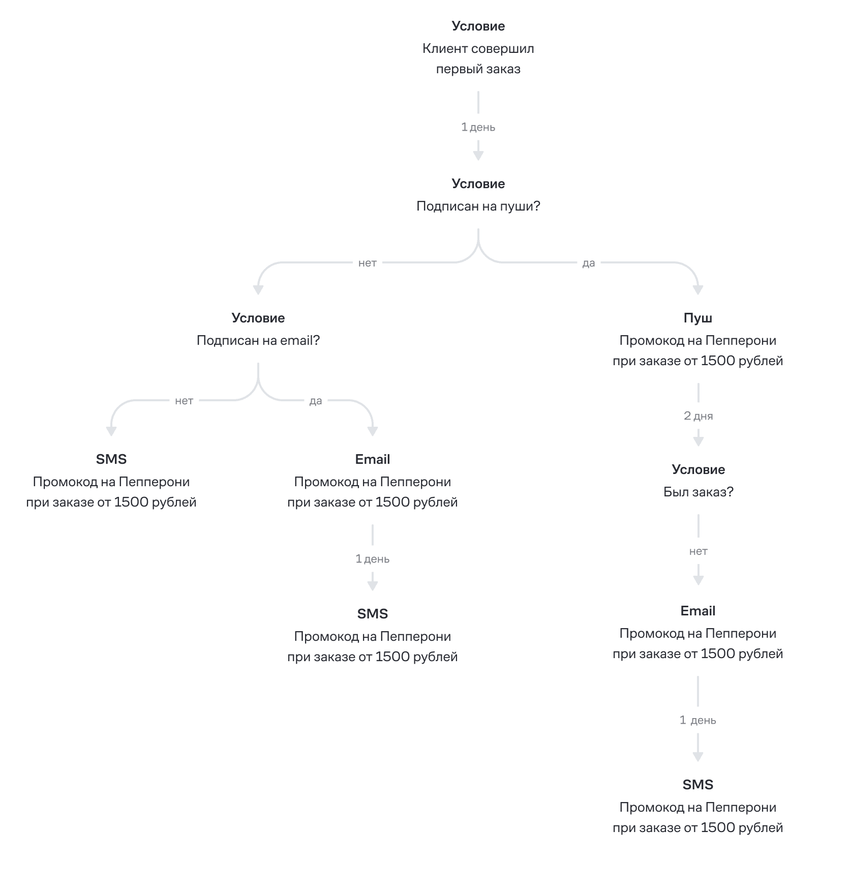 Чтобы мотивировать клиентов возвращаться, в PizzaMan работает сценарий. Через сутки после первого заказа отправляют промокод, которым можно воспользоваться в течение 14 дней при покупке пиццы. Механика приносила заказы и в ней видели потенциал для роста, поэтому команда решила ее улучшить.