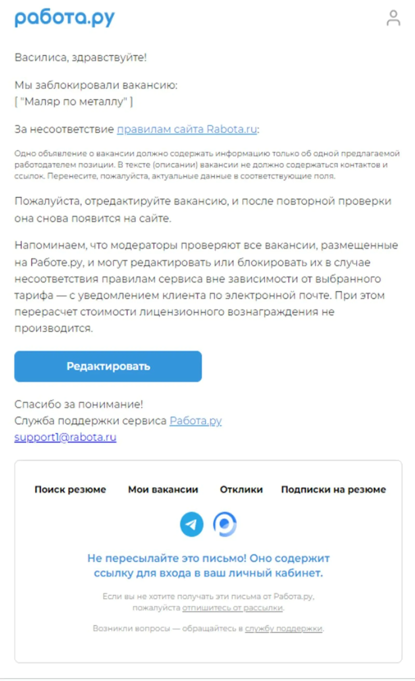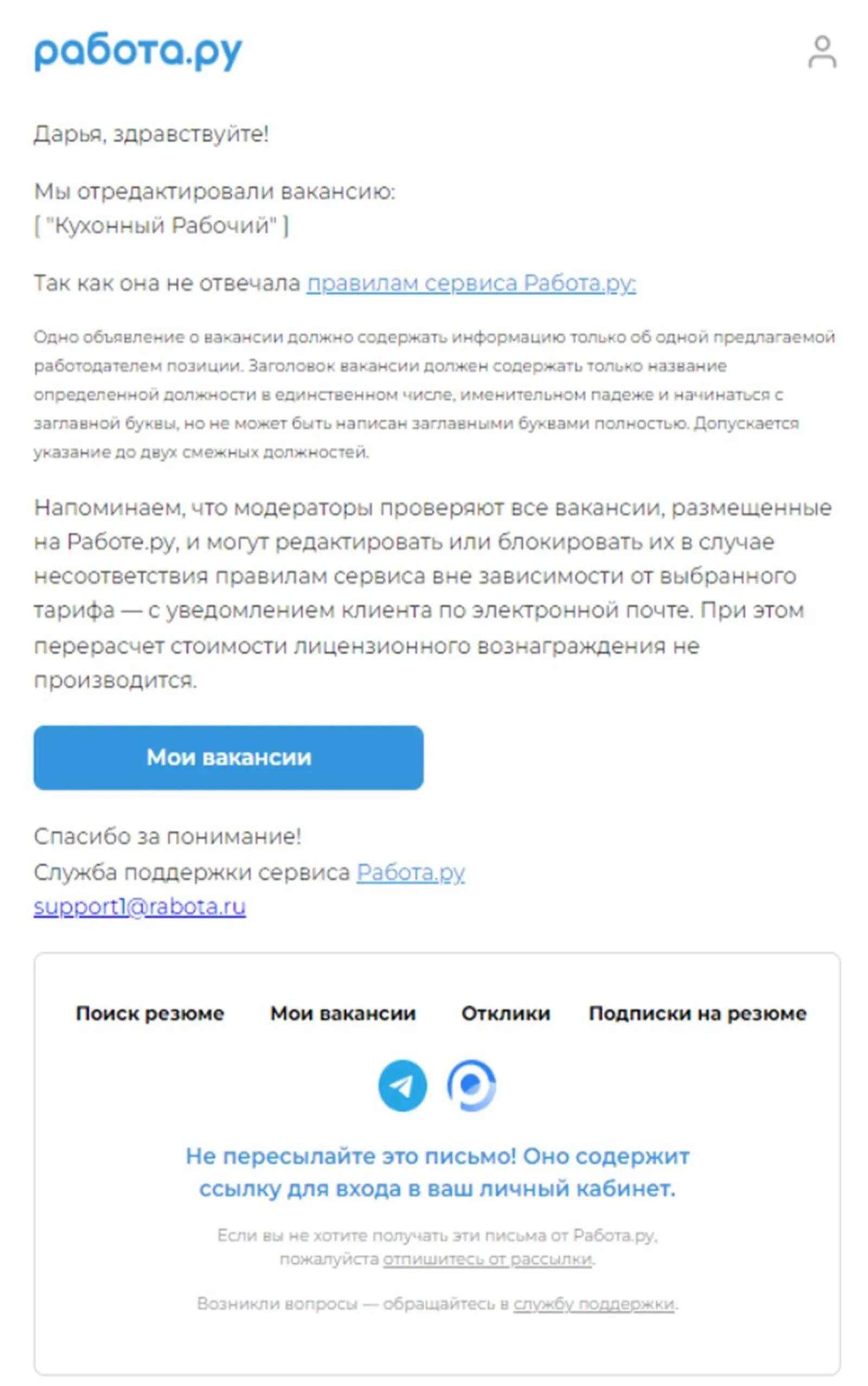 Рассылки о модерации вакансии. 32% пользователей переходят в личный кабинет из этих писем