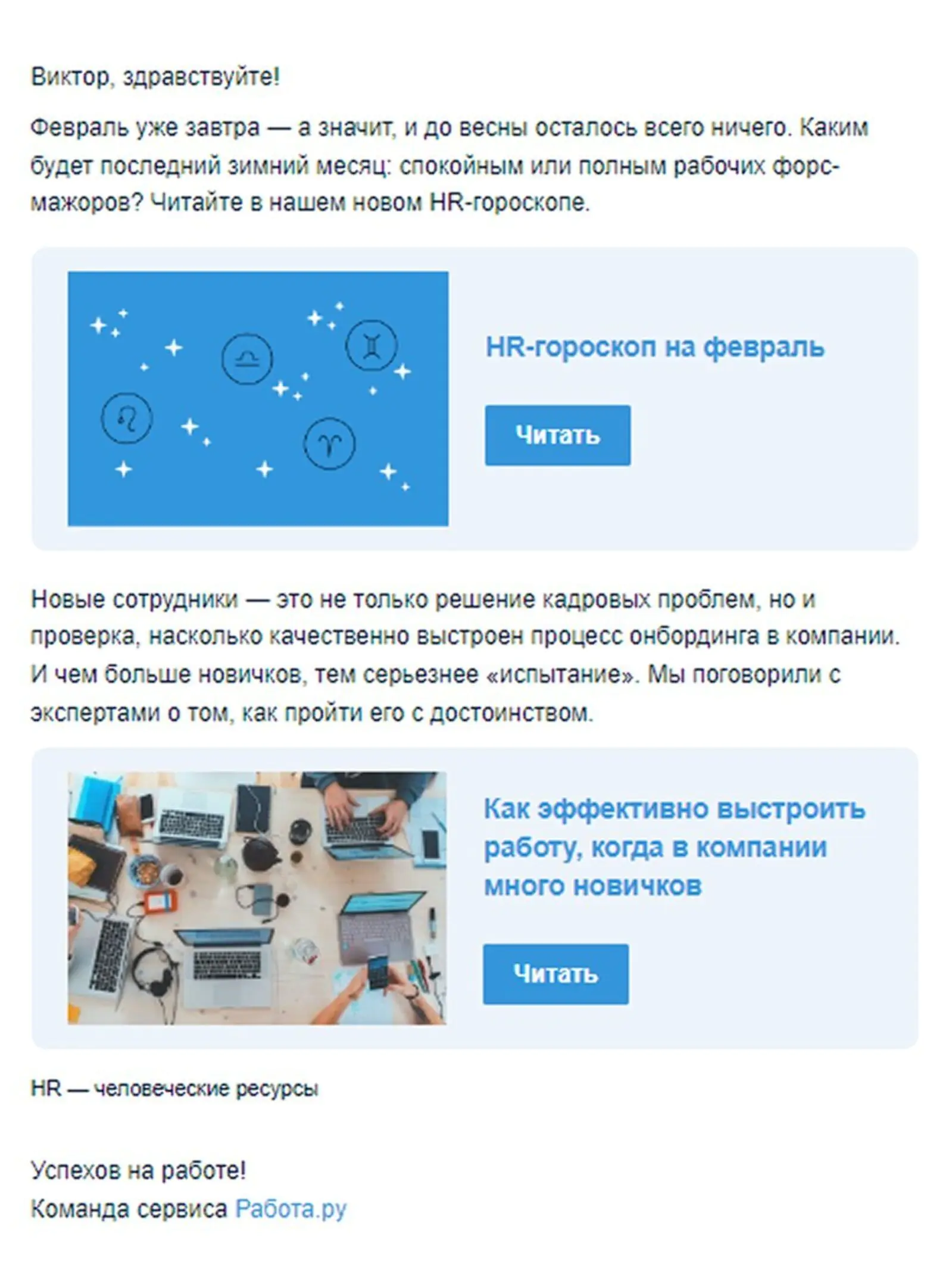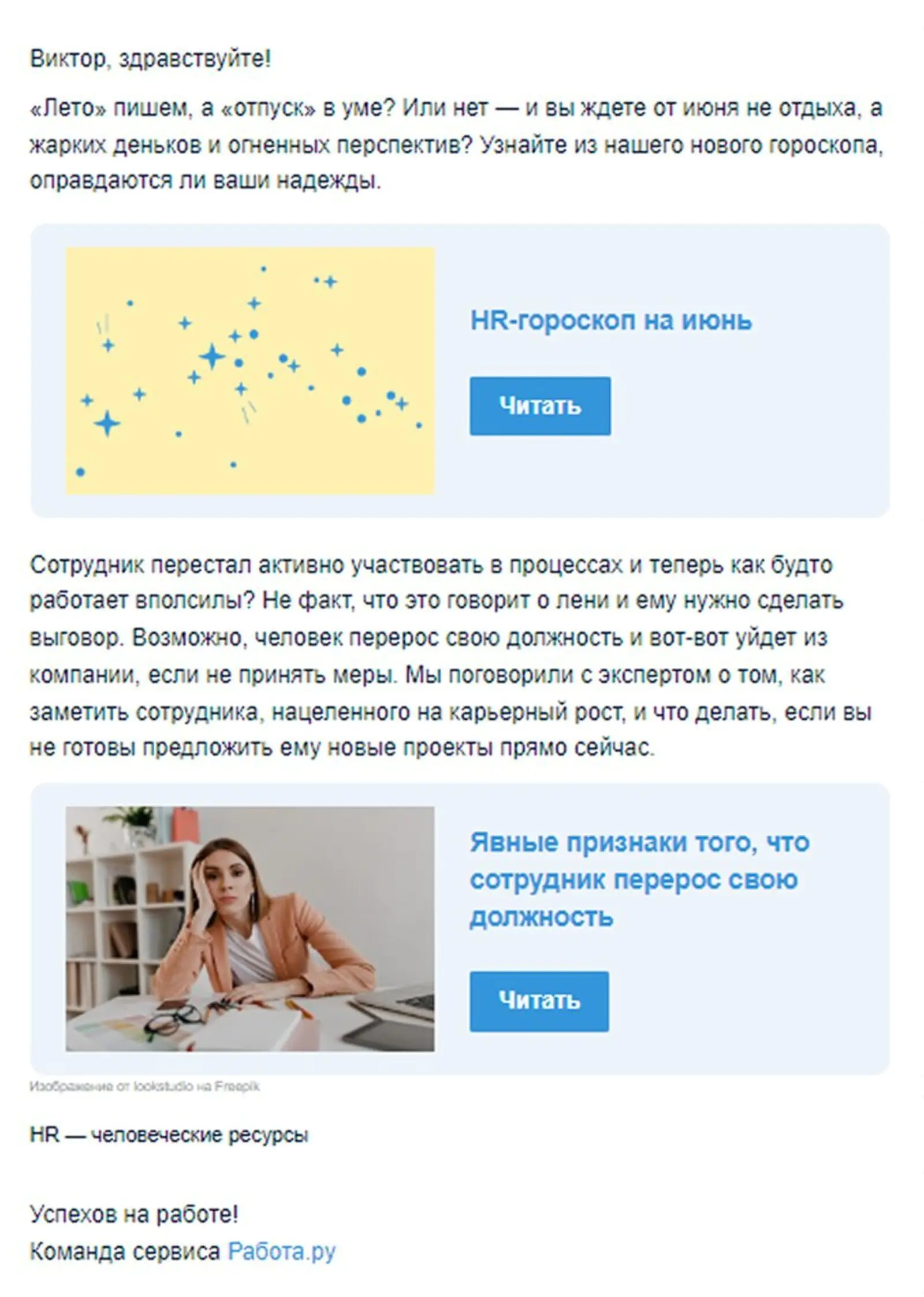 Письма с гороскопами работодателям тоже отправляют. В рассылках не дают рекомендаций по найму, а просто делятся результатами исследований рынка и предлагают пользователям немного развлечься. От других контентных рассылок такие письма отличаются более ярким дизайном и tone-of-voice с юмором.