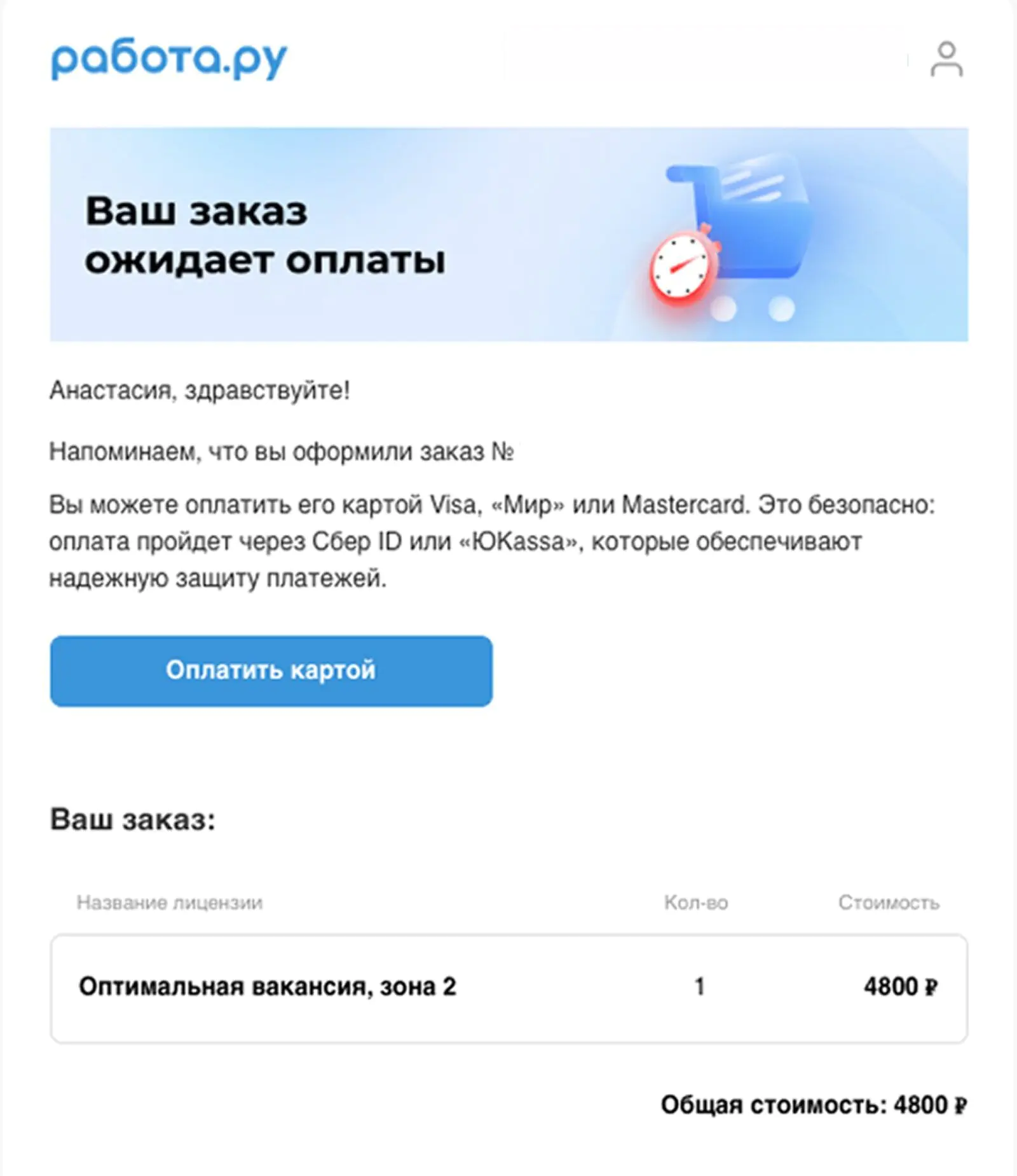 Письма с вариантами оплаты приходят через час, сутки и спустя три дня после оформления заказа
