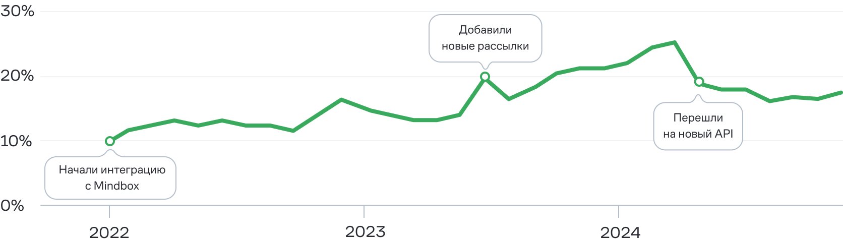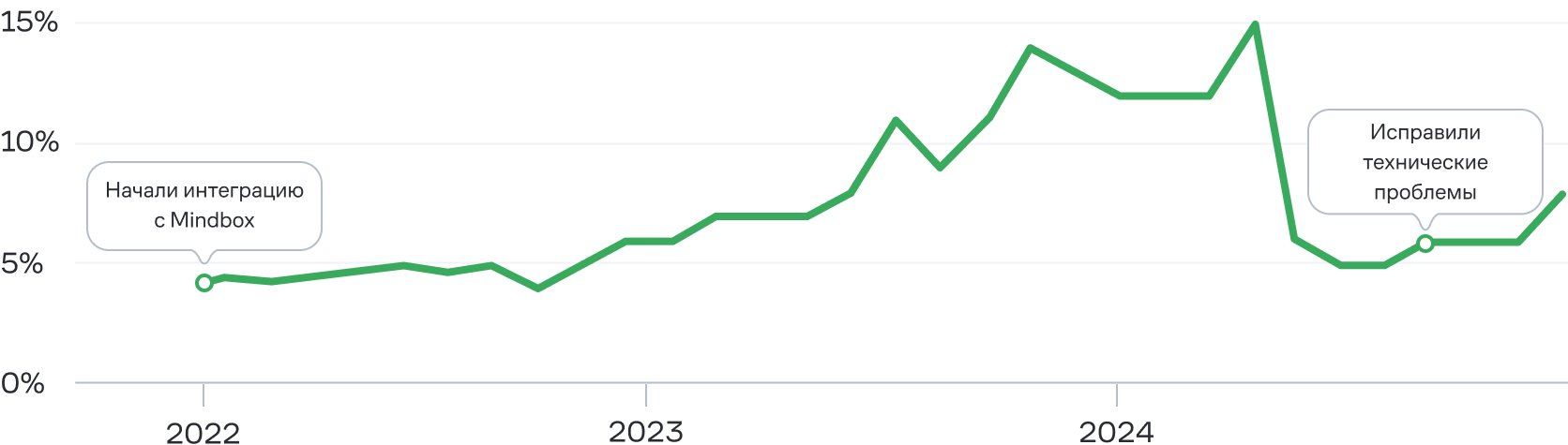 Раньше мы использовали самописный сервис рассылок и обращались за помощью к разработке. За два года работы с Mindbox мы ускорили запуск новых коммуникаций, перестали зависеть от ресурса ИТ и повысили эффективность CRM-маркетинга. Доработали базовые кампании, запустили новые и улучшаем их с помощью AB-тестов. В результате выросли целевые показатели: доля откликов из пушей повысилась с 5% до 9%.