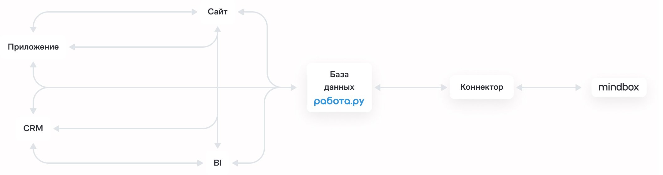 Чтобы CDP обменивалась данными с внутренними системами «Работы.ру», разработали отдельную базу данных. Она собирает информацию о соискателях и работодателях из внутренних сервисов компании и передает в CDP. На основе этих данных в Mindbox можно строить сегменты и запускать рассылки. Обратно Mindbox передает результаты рассылок: из базы данных они поступают в BI-систему.