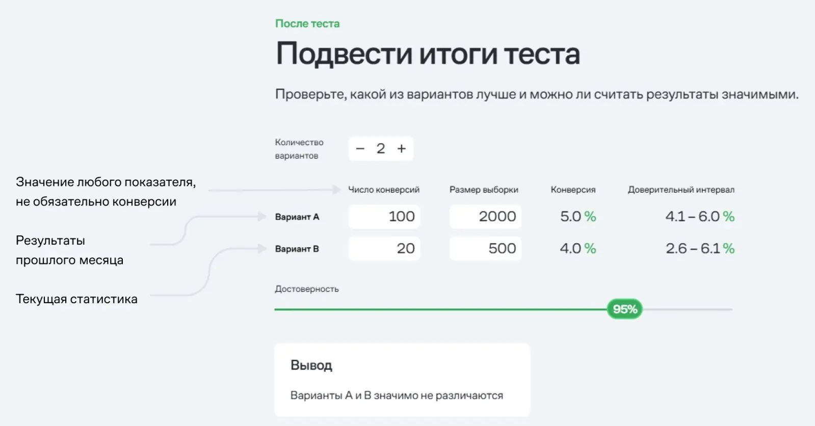 Определить статистическую значимость помогает калькулятор достоверности АB-тестов на сайте Mindbox.