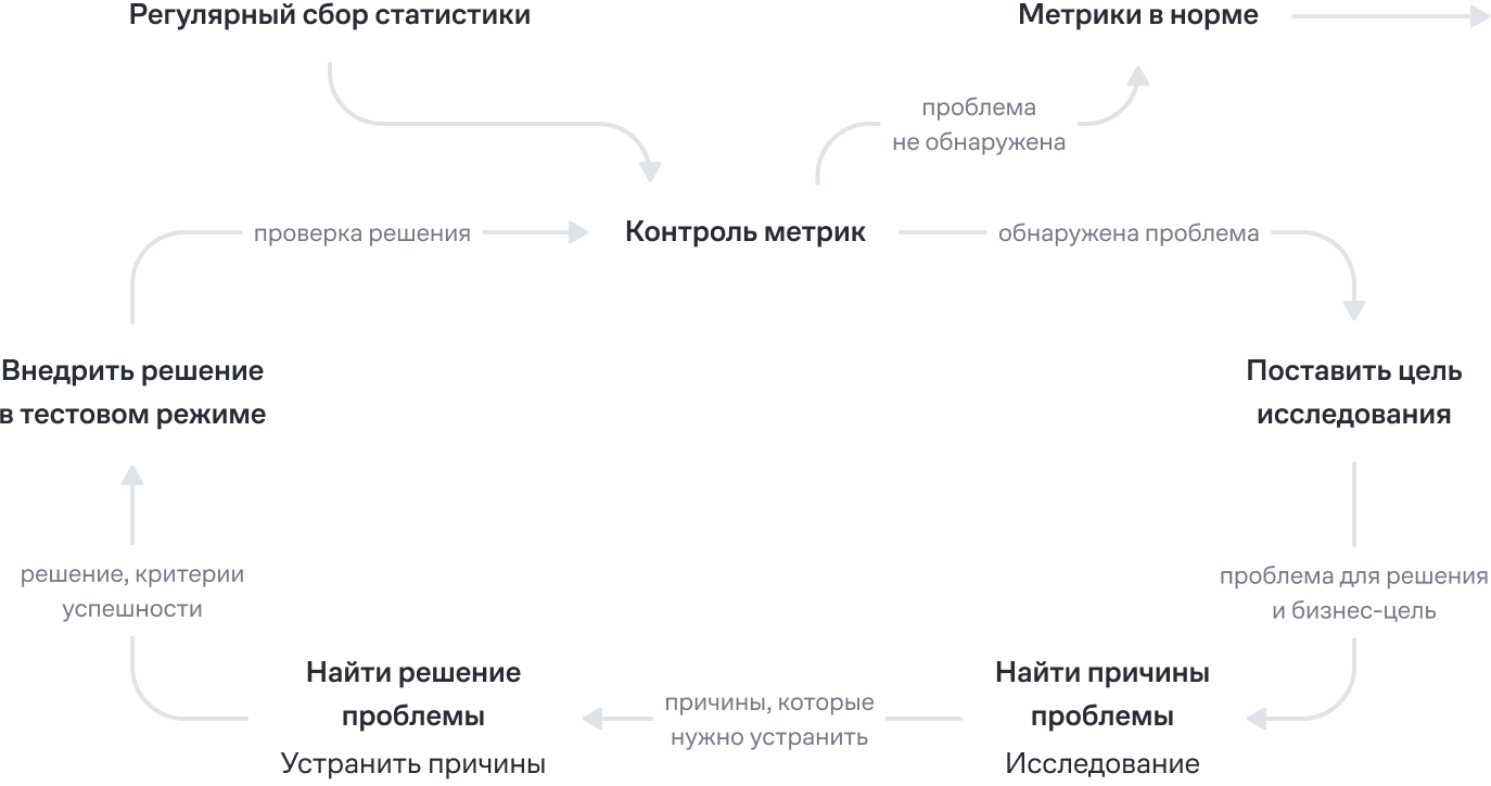 Оценить результат по метрикам. Через неделю проверили метрики старого и нового вариантов рассылки. У рассылки с новой темой конверсия в переход на сайт и продажи оказалась выше, изменения статистически значимые — решение работает. Старую рассылку отключили, всем получателям отправляют вариант с новой темой. Если решение не сработало, ищут новое или проводят повторный цикл «поиск причин — поиск решения — тестовое внедрение — контроль результатов».