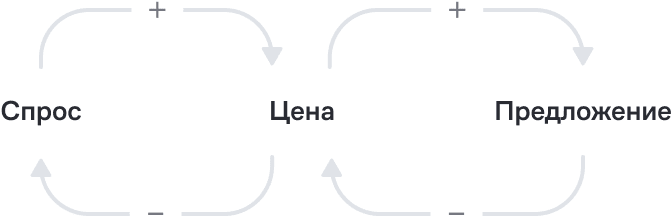 Связи в диаграмме образуют петли: усиливающие или балансирующие. Объясним на примере закона спроса и предложения: