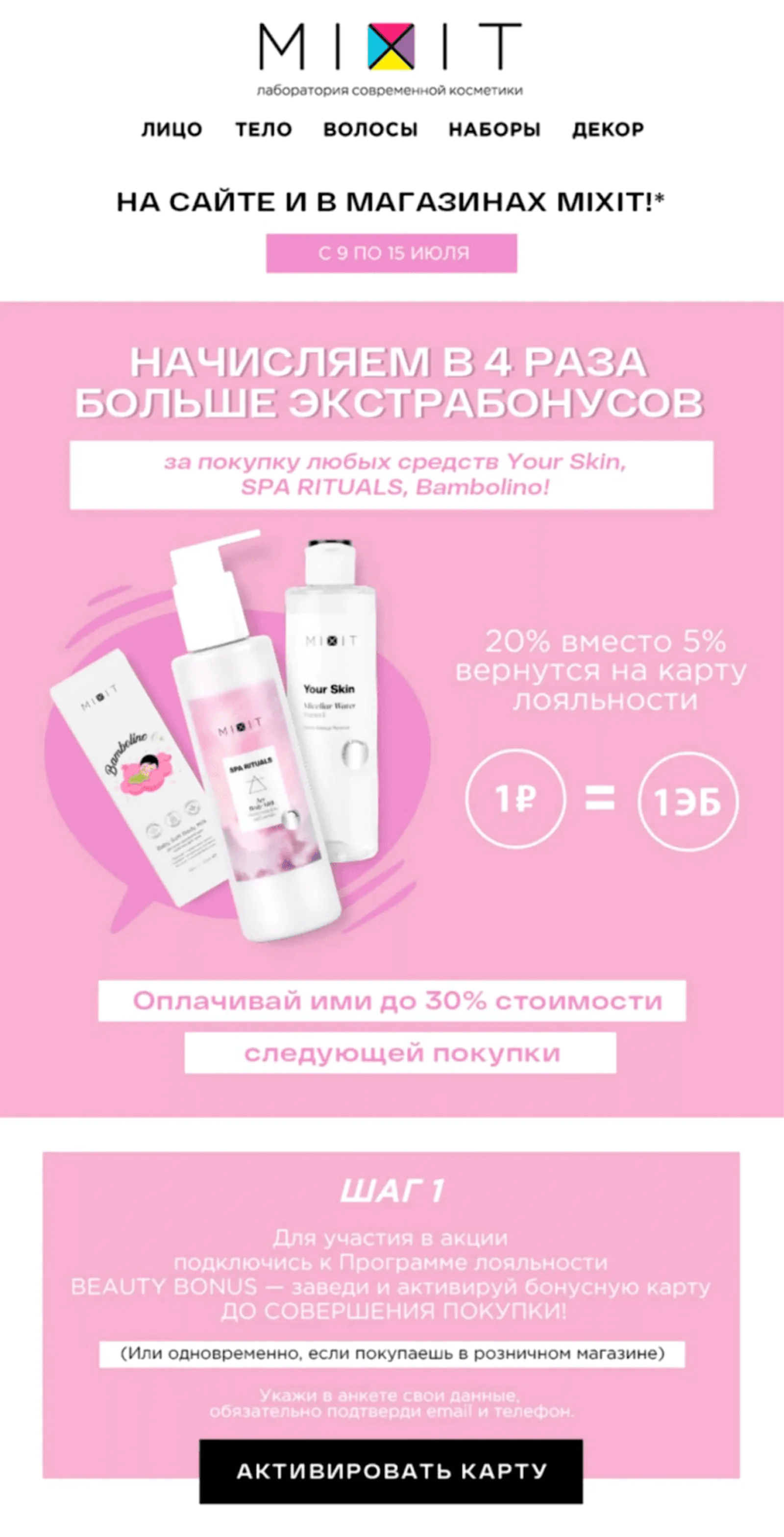 MIXIT сократил процесс регистрации до минимума — теперь нужны только имя и номер телефона. Бренд запустил таргетированные механики: единоразовые бонусы за чтение email и участие в опросе, специальные VIP-баллы для отдельных точек продаж с ограниченным сроком действия, усиленный кешбэк 20–25% против стандартных 5% на сезонные позиции.