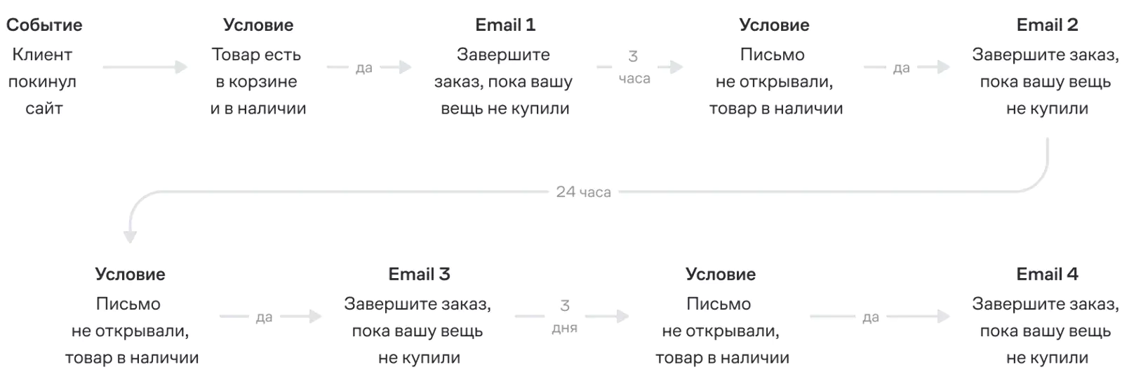 Пример сценария «брошенная корзина» в Second Friend Store. Клиентам, которые не оплатили товар в корзине, отправляют серию из четырех писем с напоминанием о покупке с разницей в три часа, сутки и три дня