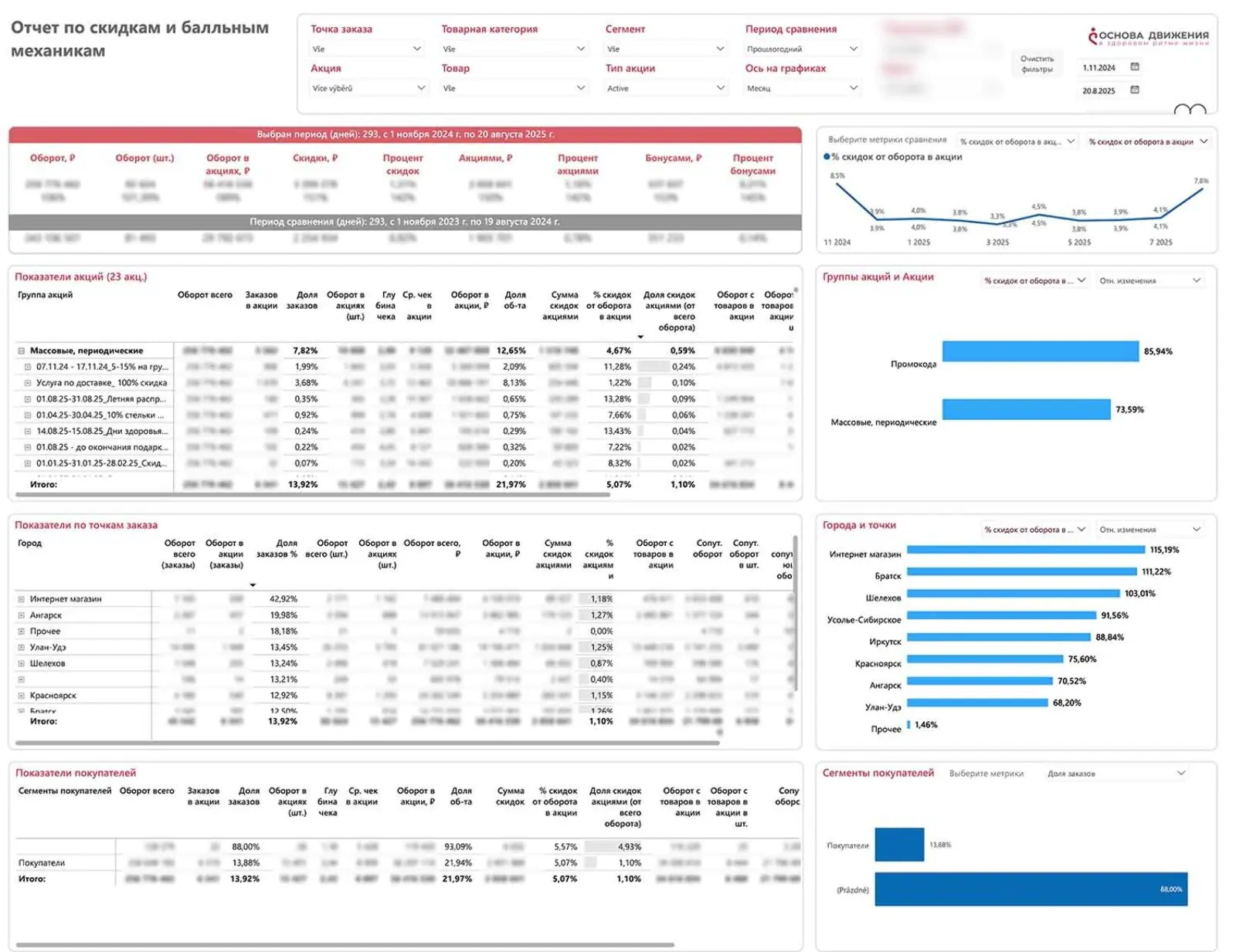 Чтобы видеть данные сразу по всем акциям в нескольких разрезах, «Основа движения» вместе с дата-агентством Coffee Analytics разработала дашборд. Он объединяет метрики промокампаний в одном окне и позволяет за час проанализировать их по товарам, брендам, клиентским сегментам и точкам продаж.