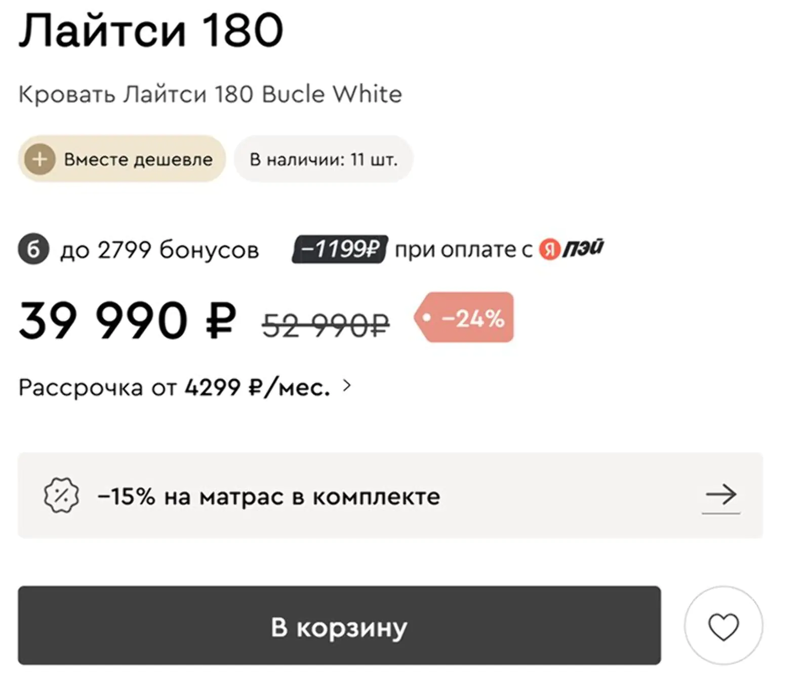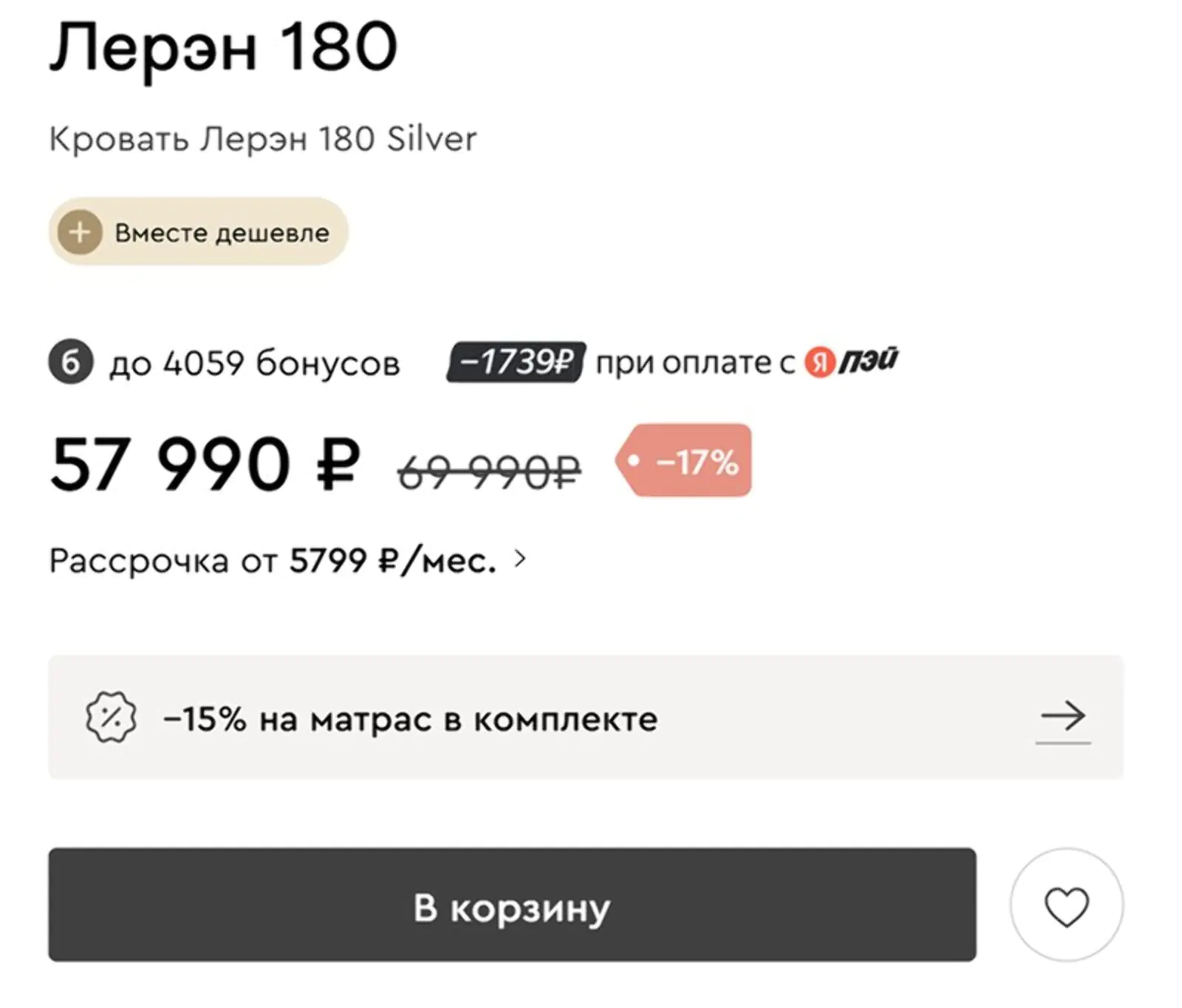 Магазин мебели divan.ru указывает в карточках товаров цену с рассрочкой. Клиент, который изначально не был готов покупать кровать дороже 30 000 ₽, может передумать, узнав о рассрочке, потому что разница в ежемесячных платежах кажется незначительной. Например, кровать «Лерэн» в рассрочку обходится примерно на 1000 ₽ в месяц дороже модели «Лайтси». Для части покупателей эта сумма некритична, и они выбирают более дорогой вариант.