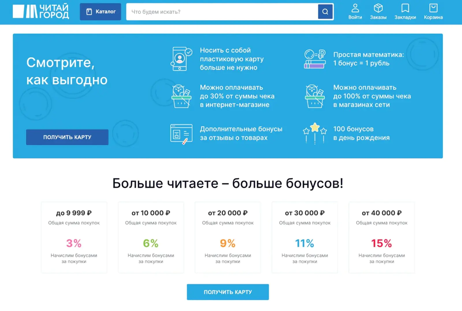 Условия программы лояльности на сайте «Читай-города» выглядят понятными — чем больше покупок, тем выше уровень и кешбэк