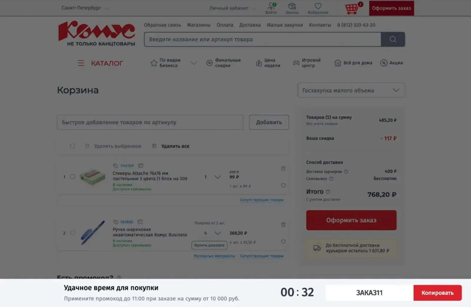 Баннер с таймером на сайте «Комуса» помогает привлечь внимание к горящей акции