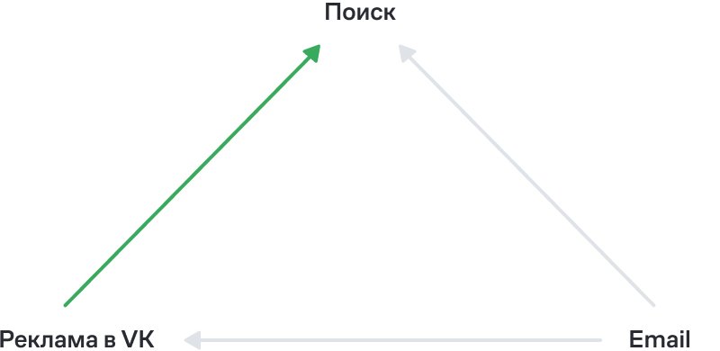 Если представить ситуацию упрощенно и допустить, что у нас всего три канала, можно изобразить их вершинами треугольника. Модель анализирует, насколько часто пользователи двигаются по «ребрам» между вершинами — от поиска к email, от email к VK. Другими словами — как часто комбинация каналов встречается на пути к конверсии.