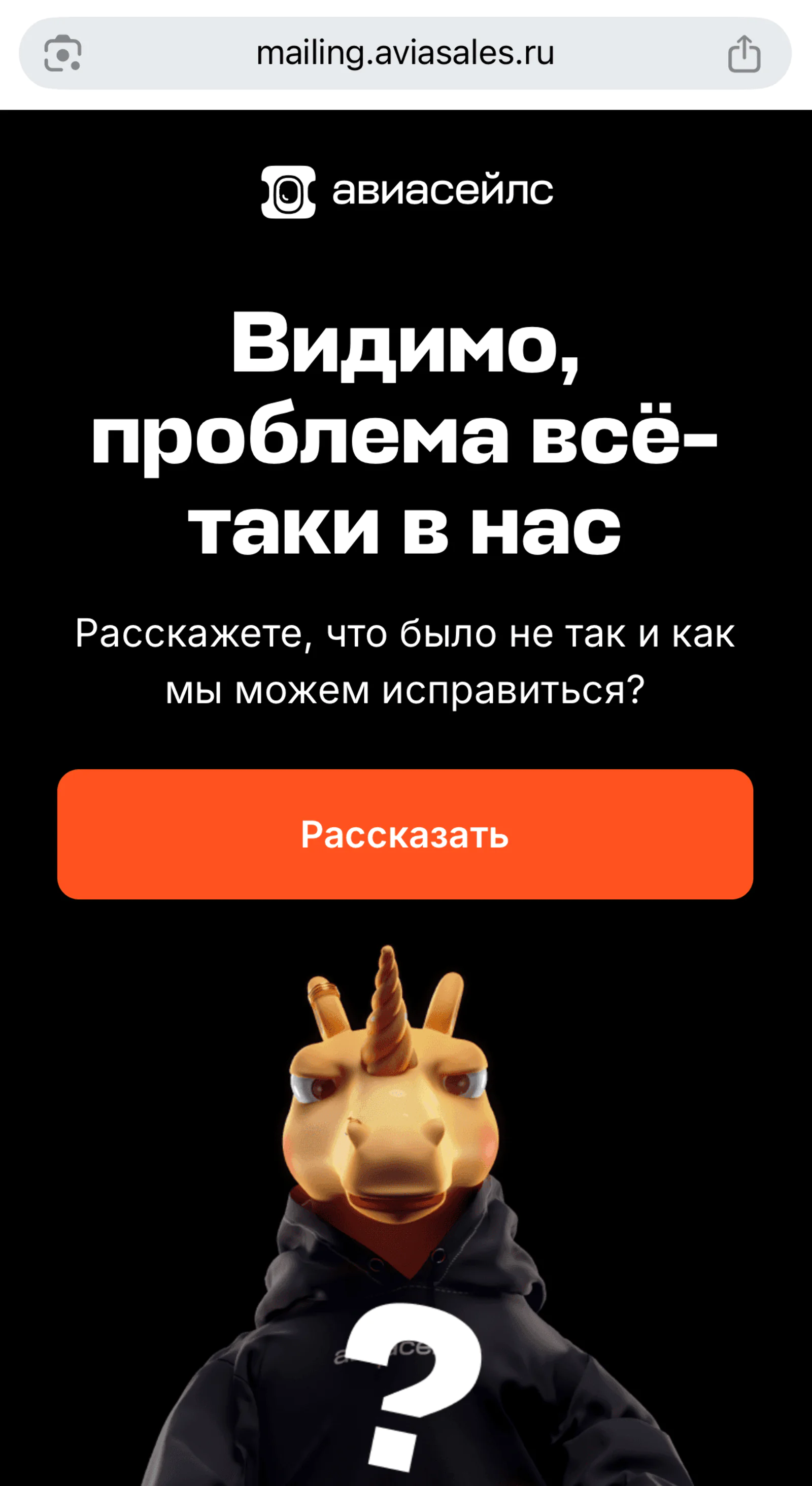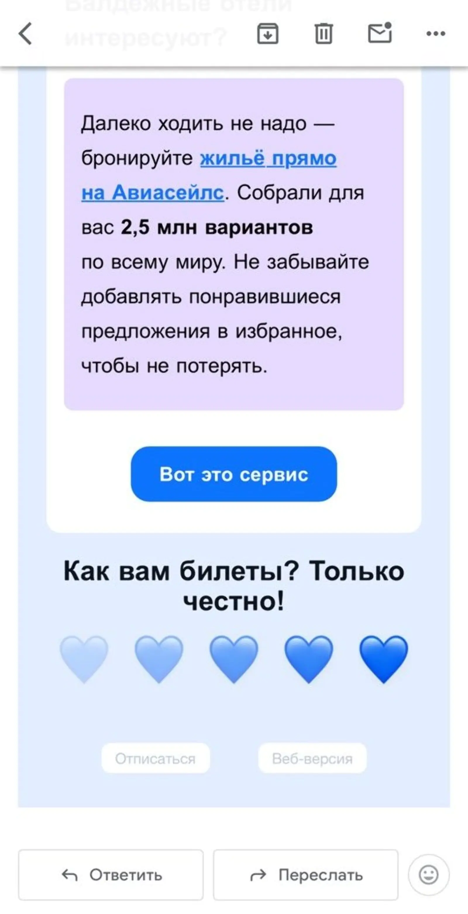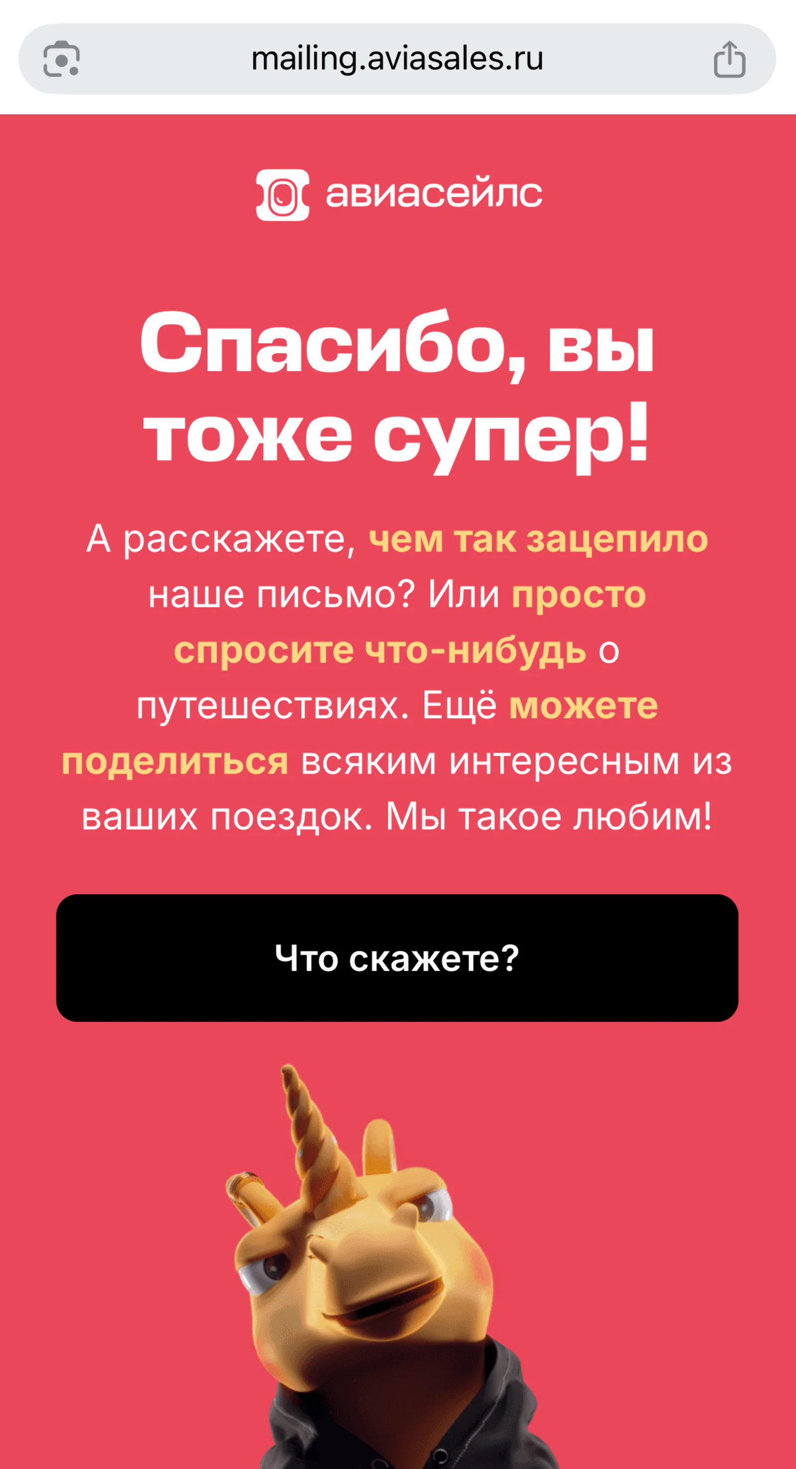 Сервис для покупки авиабилетов «Авиасейлс» использует встроенные опросы в рассылках. В зависимости от поставленной оценки пользователю открываются разные страницы, где можно оставить развернутый комментарий