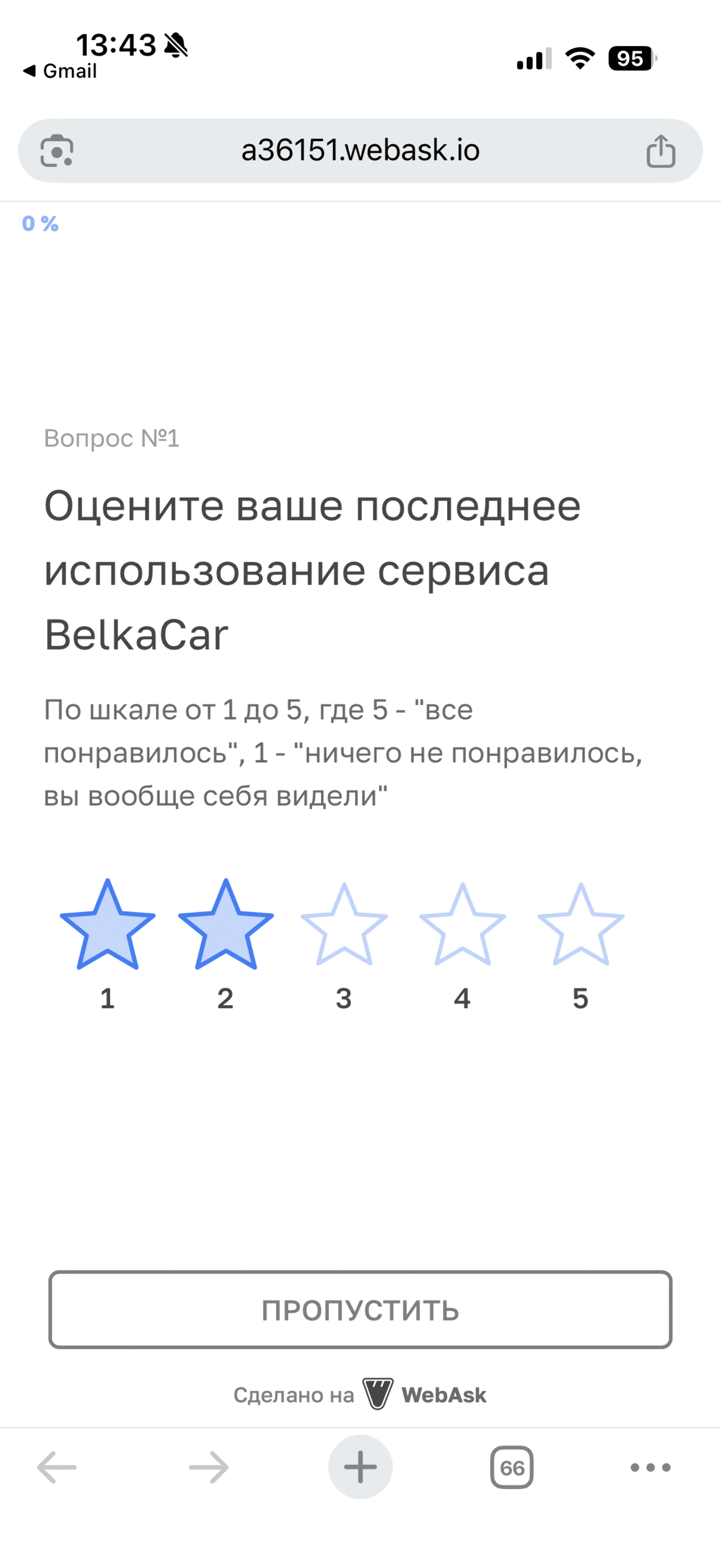 Каршеринг BelkaCar использует NPS-опросы для оценки удовлетворенности клиентов, которые не пользовались сервисом больше полугода. Перейдя по ссылке из письма, можно оценить последнюю поездку по пятибальной шкале. Также компания спрашивает о причинах снижения активности пользователя и факторах, влияющих на выбор сервиса для аренды автомобиля.