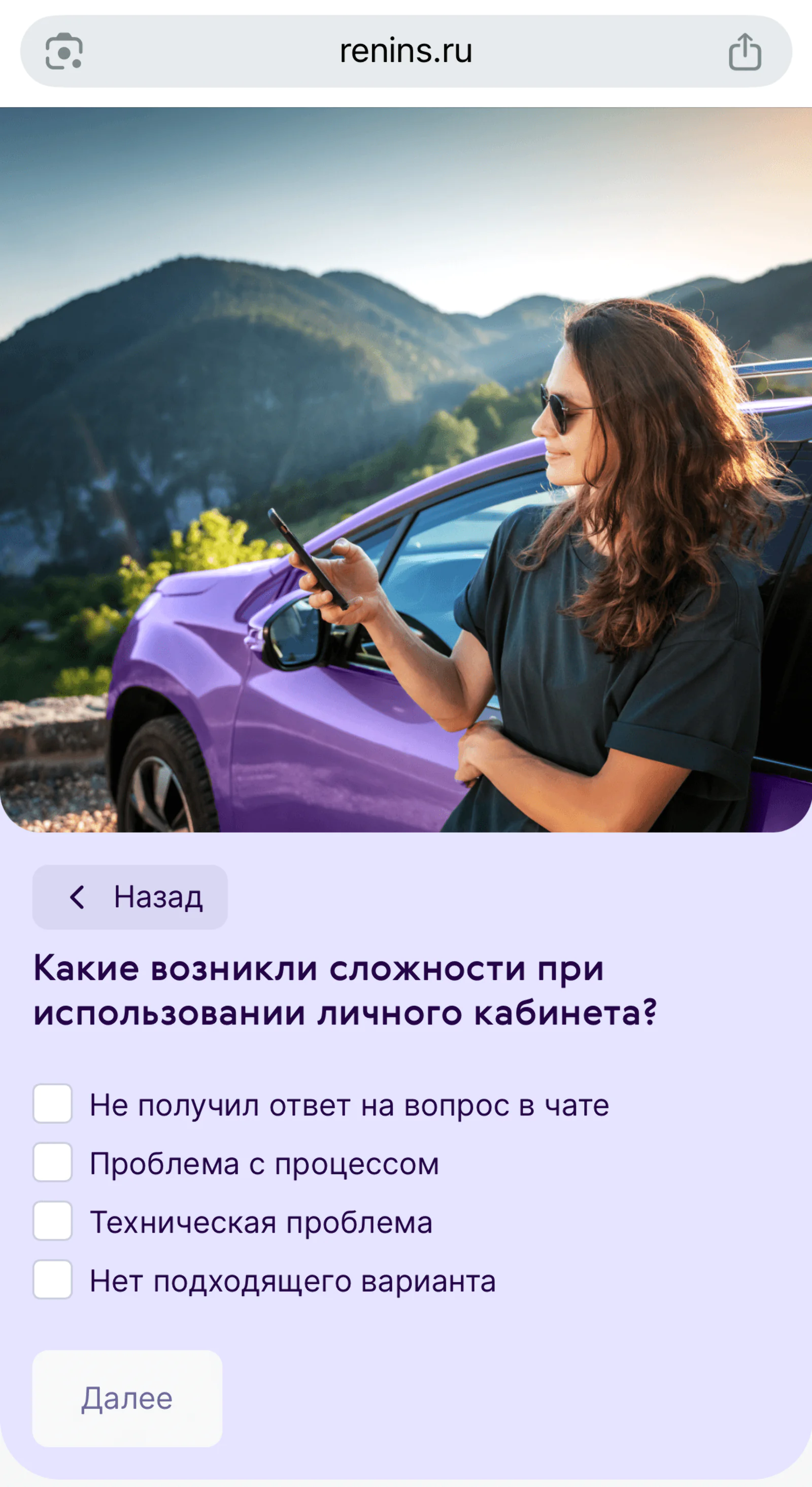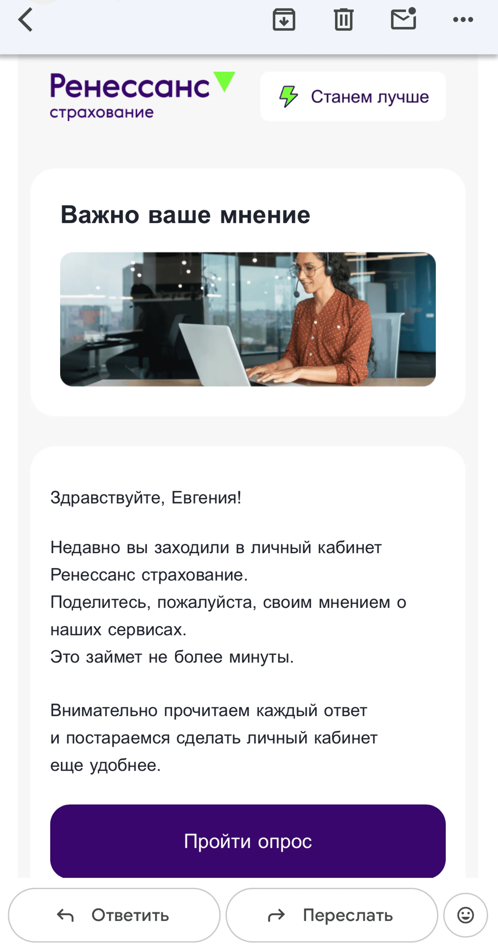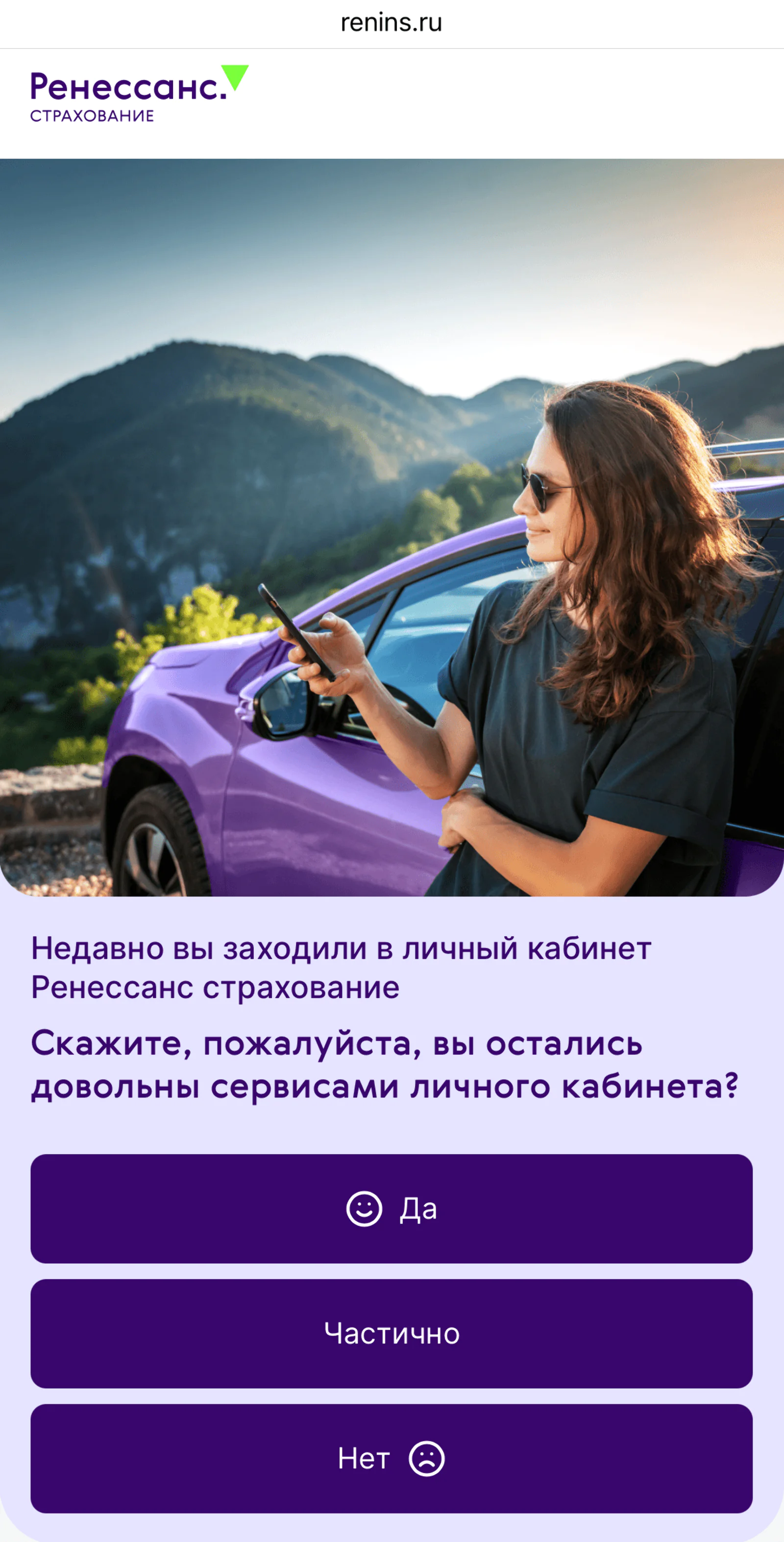 Страховая компания «Ренессанс» отправляет опрос об использовании личного кабинета. Пользователь кликает на кнопку в письме и попадает на форму сбора обратной связи на сайте страховщика