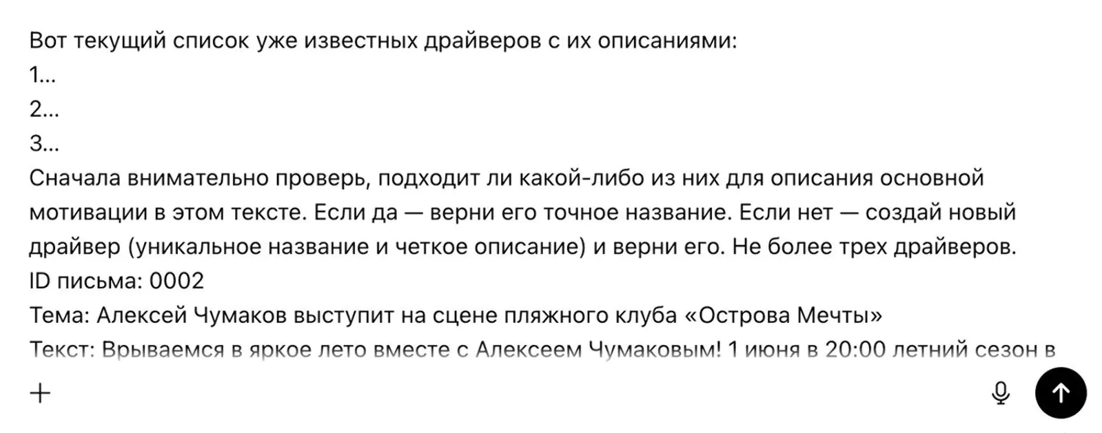 После первичной обработки рассылок LLM создает список из сотен похожих по смыслу драйверов. Например, «бесплатное участие», «свободный вход», «мероприятие без оплаты». Так происходит, потому что языковые модели чувствительны к малейшим различиям в формулировках.