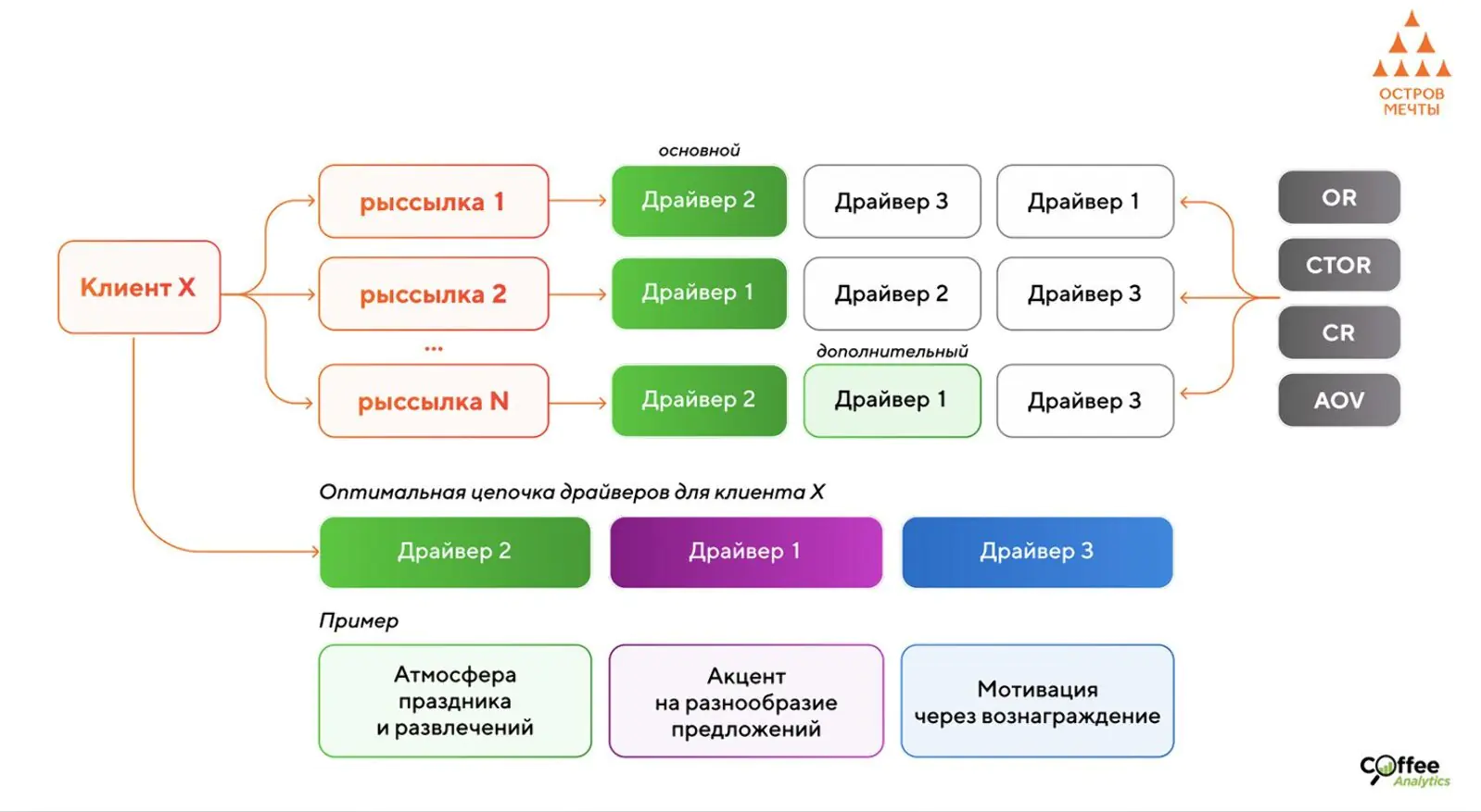 Чтобы определить главные стимулы для каждого клиента, датасет с клиентскими данными сопоставляют с таблицей, где рассылки размечены финальными драйверами. В результате получается матрица «клиент — драйвер», которая показывает, какие стимулы сильнее всего влияют на каждого конкретного клиента. Данные об основных драйверах записываются в профиль клиента в CDP.