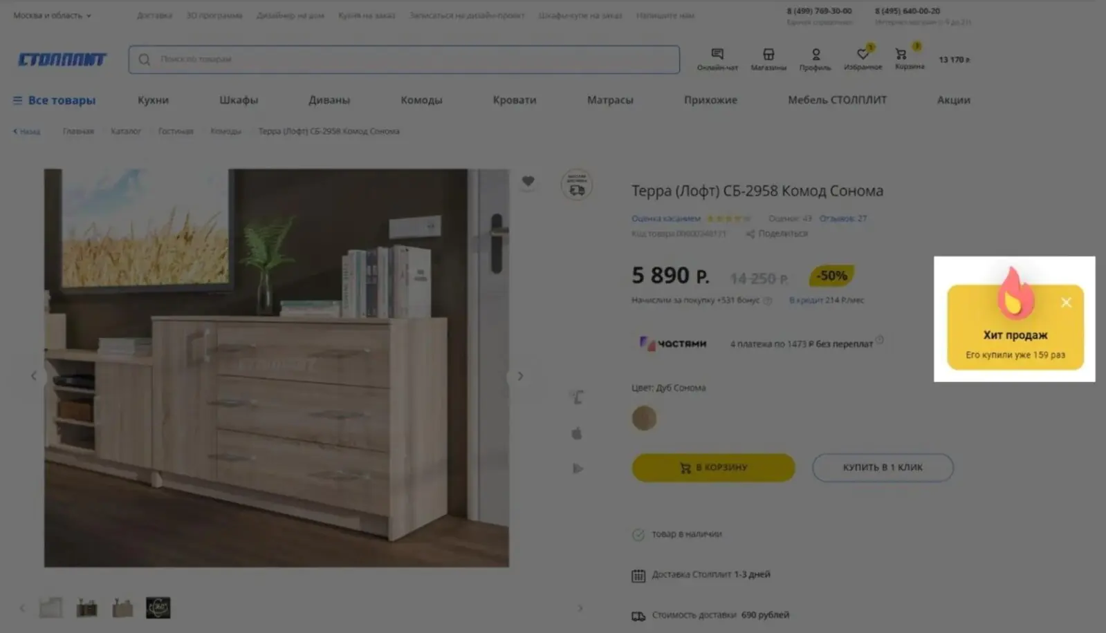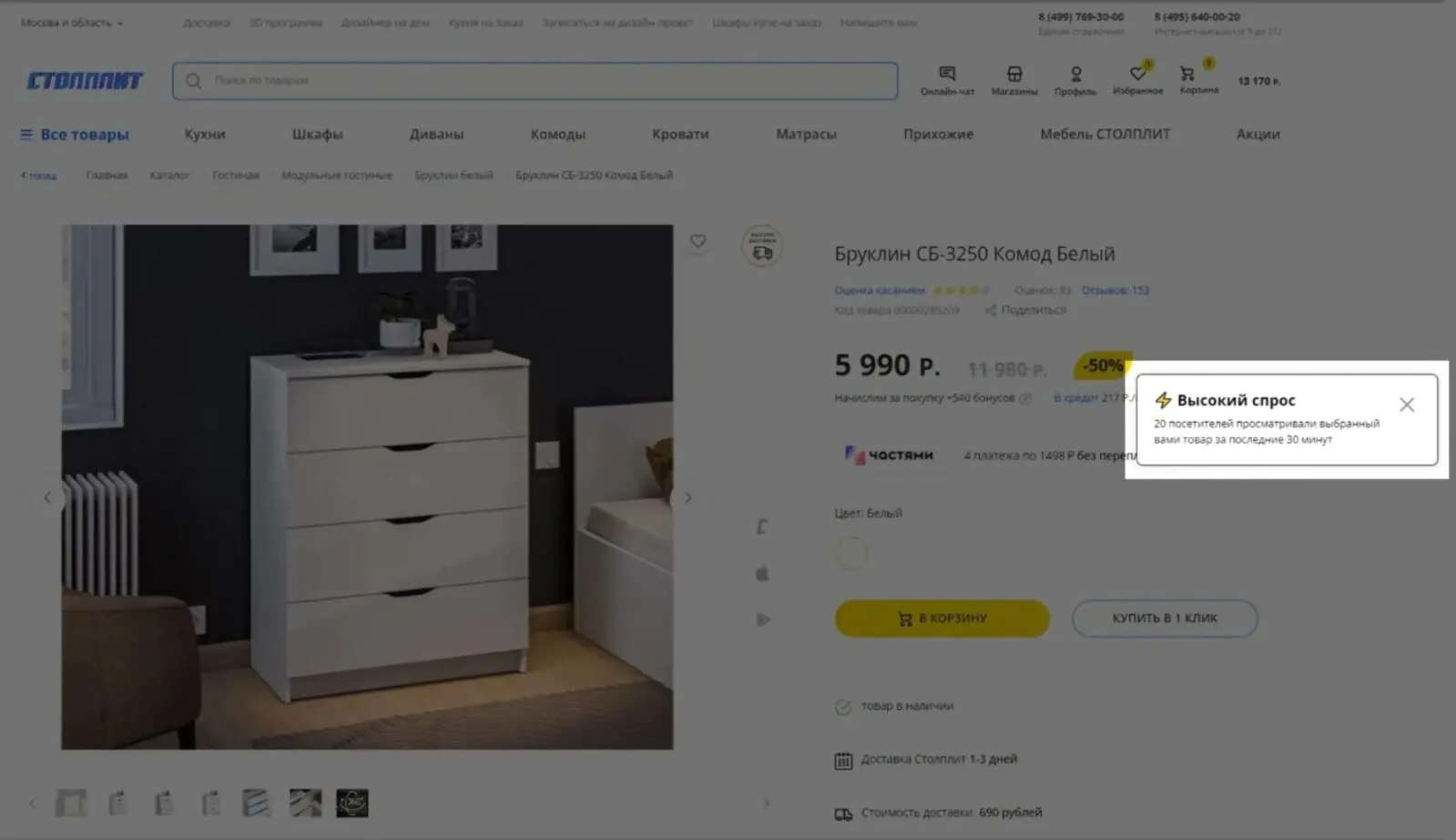 Попап социального доказательства. В Mindbox можно персонализировать карточку товара с помощью попапов «высокий спрос» или «хит продаж», а также настроить время и частоту их появления. Например, оба таких всплывающих окна установлены на сайте «Столпита». АВ-тесты показали, что с «хитом продаж» конверсия в заказ увеличивается на 0,14%, ARPU — на 16%. А с «высоким спросом» конверсия в заказ выше на 0,3%, ARPU — на 24,5%.