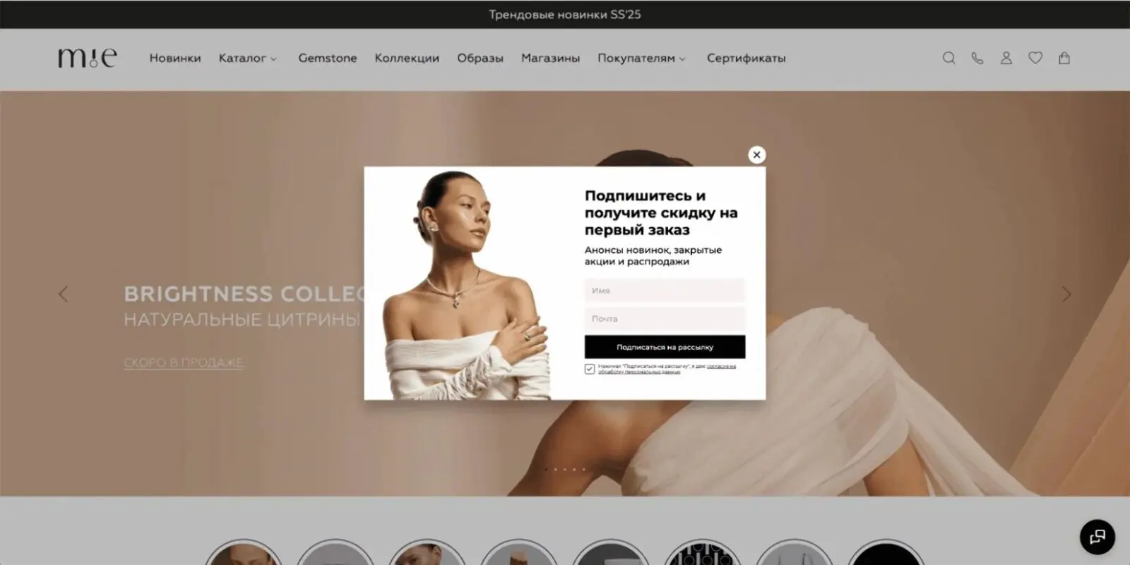 Новым пользователям или тем, чей email неизвестен, можно показывать попапы, мотивирующие оставить контакты. Например, на сайте бренда ювелирных украшений MIE за подписку на рассылку дарят скидку на первый заказ. Конверсия из показа в подписку — 1,22%.