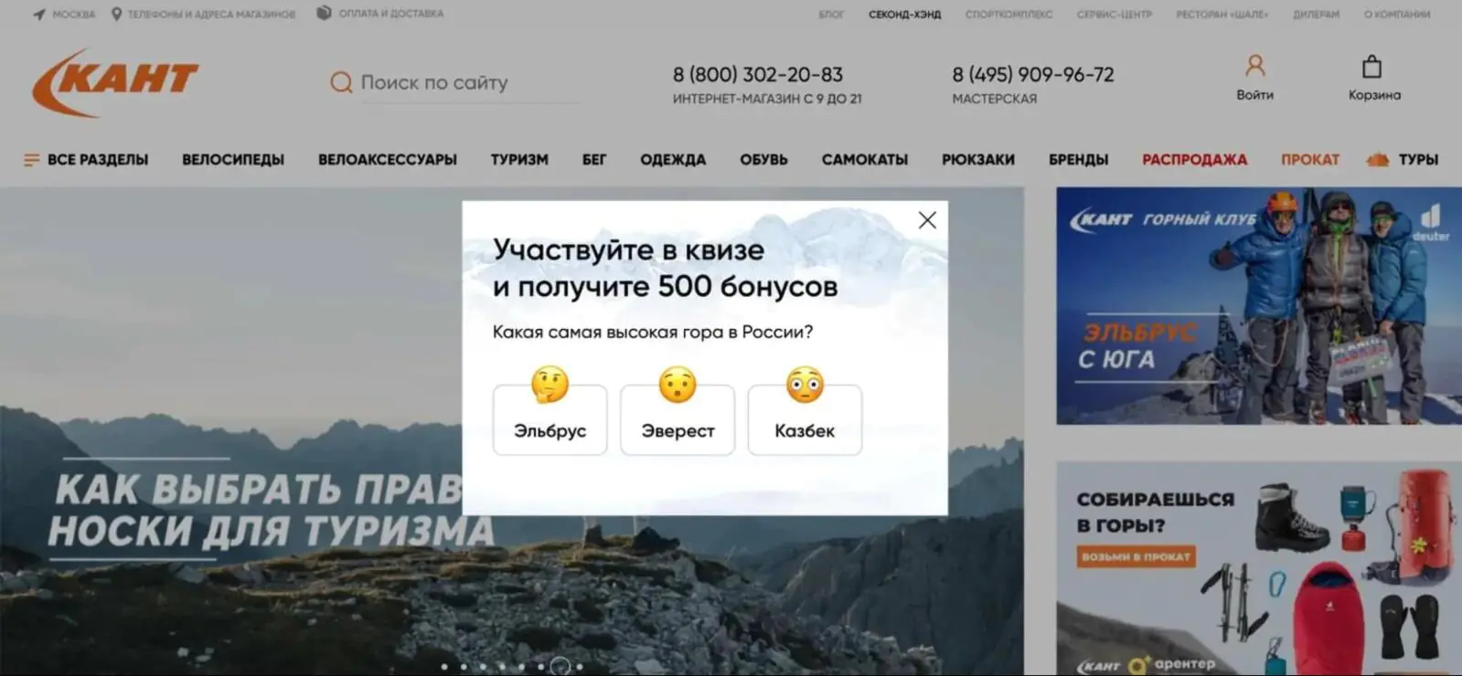 В интернет-магазине «Кант» наибольшую конверсию показывает геймифицированный попап. Это короткая викторина с вариантами ответа, которая побуждает пользователей проверить свои знания. Конверсия в оставленный контакт — 4,5%.