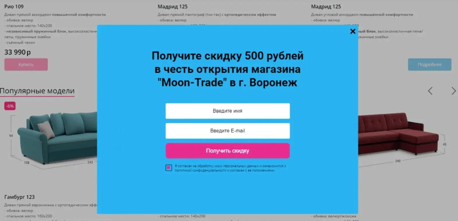 Задача попапов — стимулировать к покупке пользователей, перешедших из рекламы. Постоянным покупателям и тем, кто уже наполнил корзину, их не показывают, чтобы не надоедать