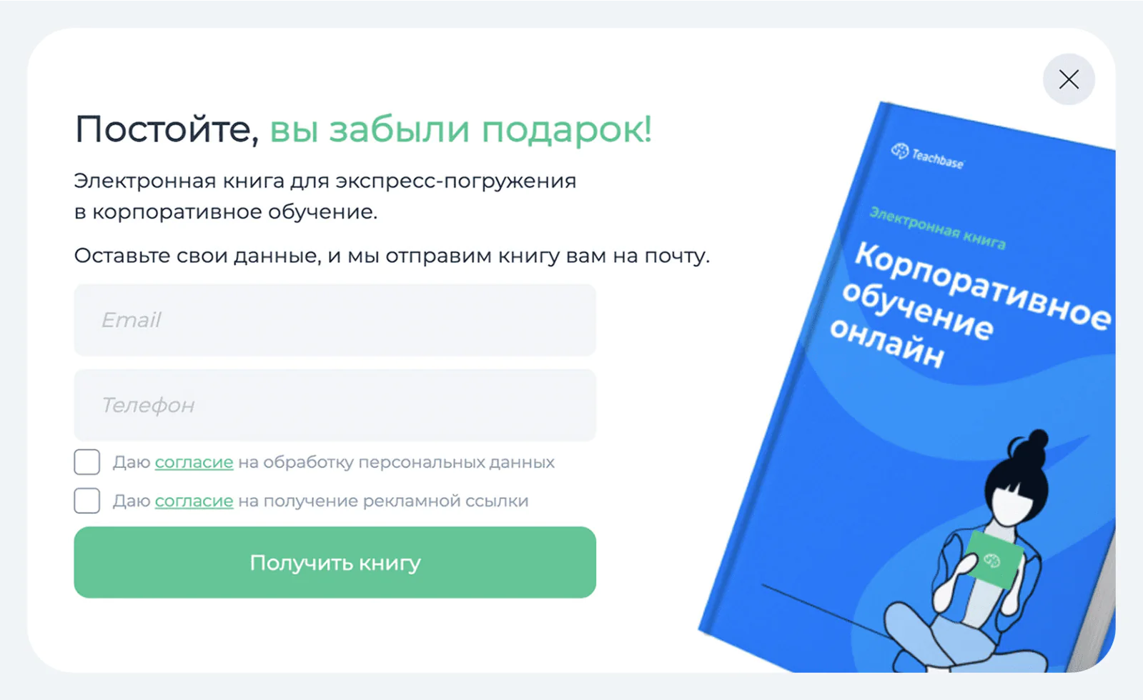 На сайте компании Teachbase за оставленный контакт дарят электронную книгу. CRM-команда проанализировала поведение пользователей за полгода и выяснила, что в среднем посетители уходят с сайта через девять минут. Поэтому попап появляется спустя девять минут после начала сессии. Конверсия попапа — 38%.