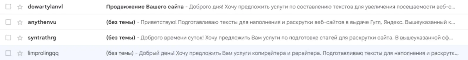 Контент, который вызывает подозрение у почтовых сервисов. Это могут быть вложения, которые надо скачать, стоп-слова и изображения без текста. Алгоритмы почтовых сервисов не раскрывают полный перечень стоп-слов и фраз, поэтому любые слова вроде «срочно», «быстро» или «нажми» могут оказаться потенциально рискованными. Поскольку совсем не использовать их, скорее всего, не получится, важно употреблять их как можно реже и следовать остальным рекомендациям почтовых служб.
