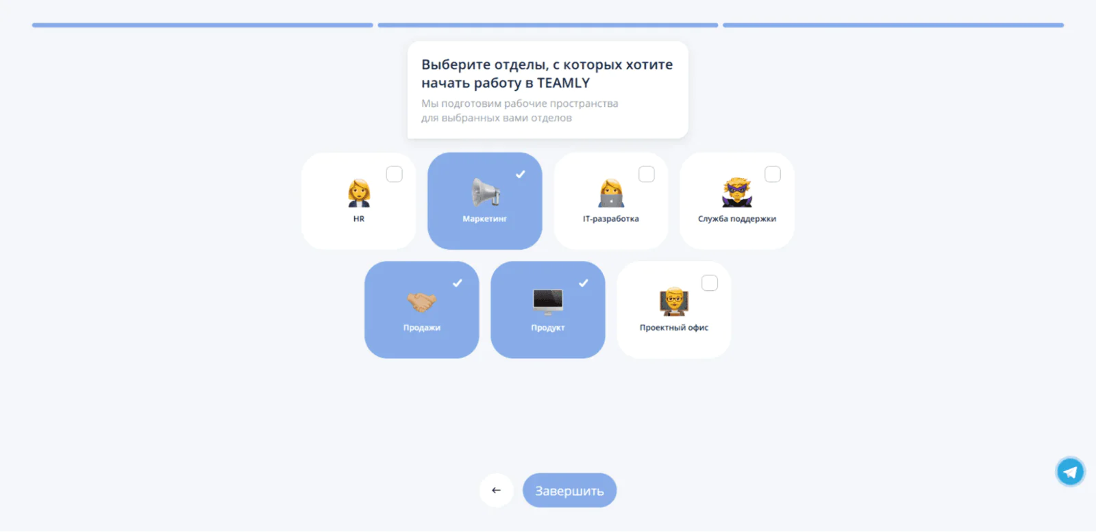 Короткий квиз помогает Teamly персонализировать функции платформы для каждого клиента