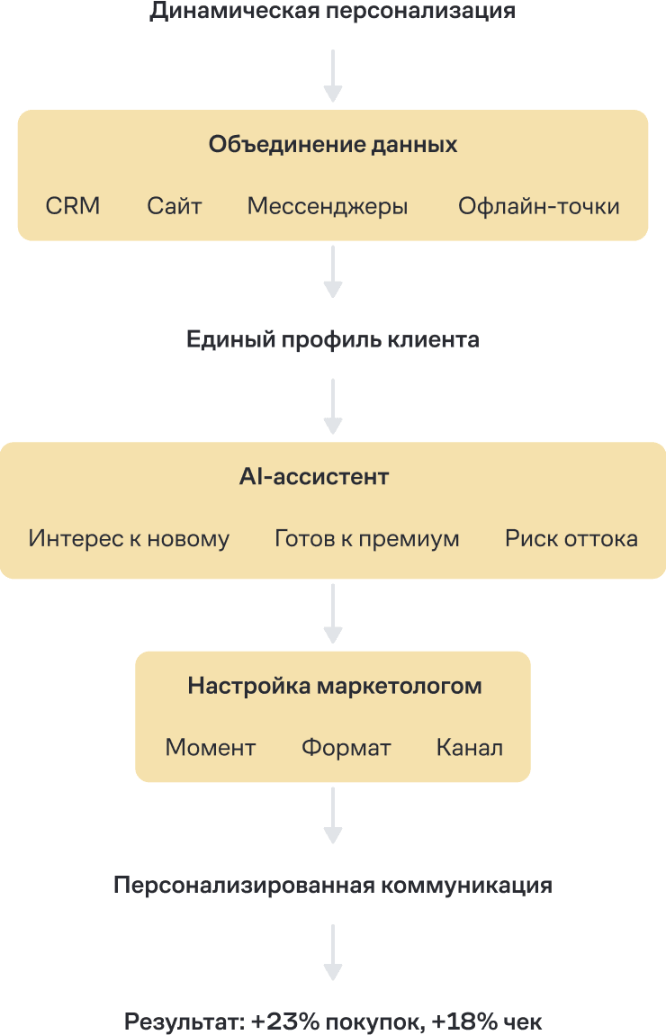 Такой уровень точности возможен благодаря CDP и AI-моделям, которые объединяют данные из CRM, мессенджеров, соцсетей, сайта и кассы. Система строит предсказания — кто собирается уйти, кто готов к апсейлу, а кому пора напомнить о себе.