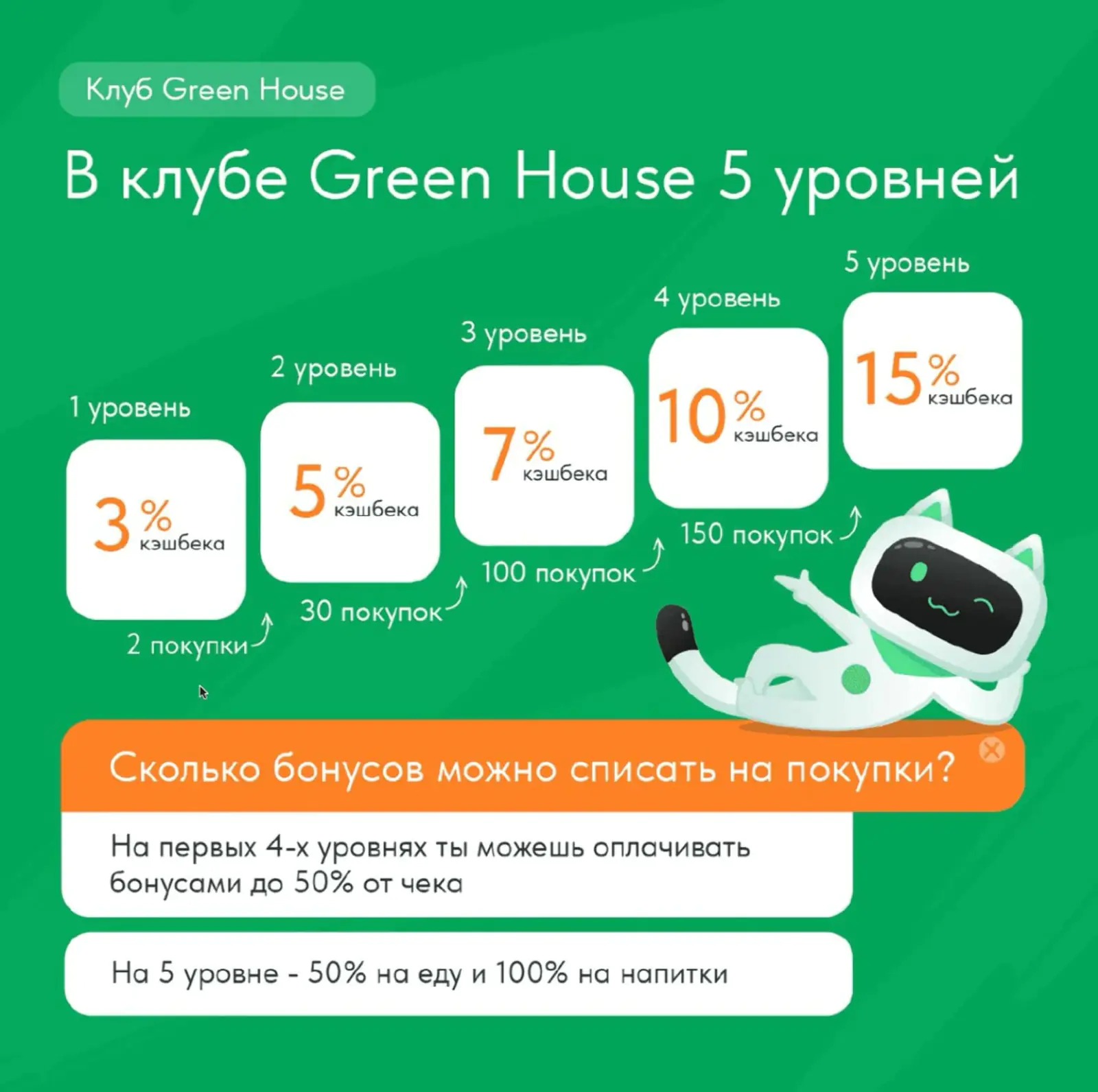 В программе лояльности кофейни Green House пять уровней. На каждом последующем кешбэк выше, а на пятом можно полностью оплачивать напитки бонусами. За восемь месяцев после внедрения программа привлекла более 100 тысяч участников, а число покупок одного клиента в месяц увеличилось с 1,9 до 4.