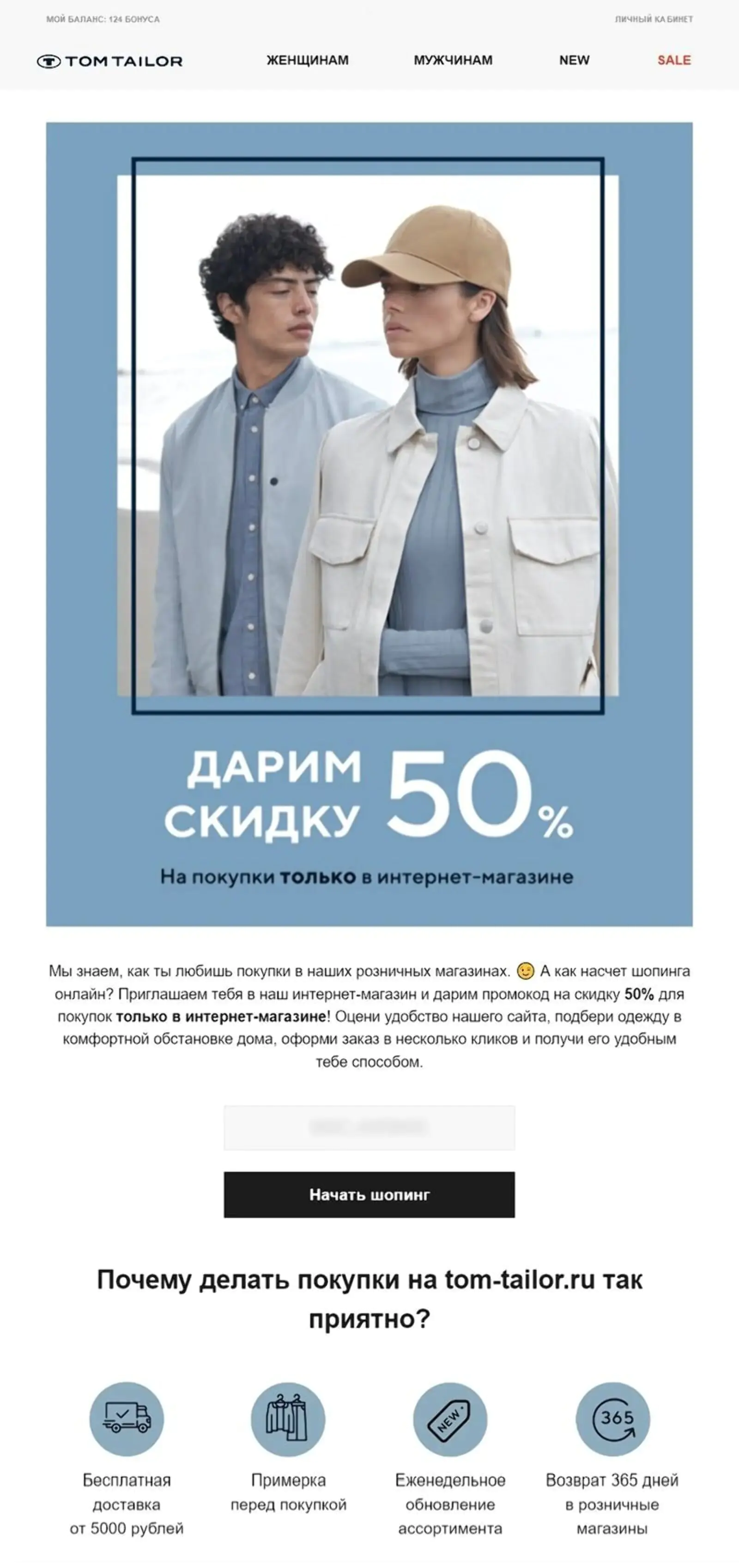 Рассылка об акции со скидкой в 50%, чтобы привлечь покупателей из офлайна в онлайн