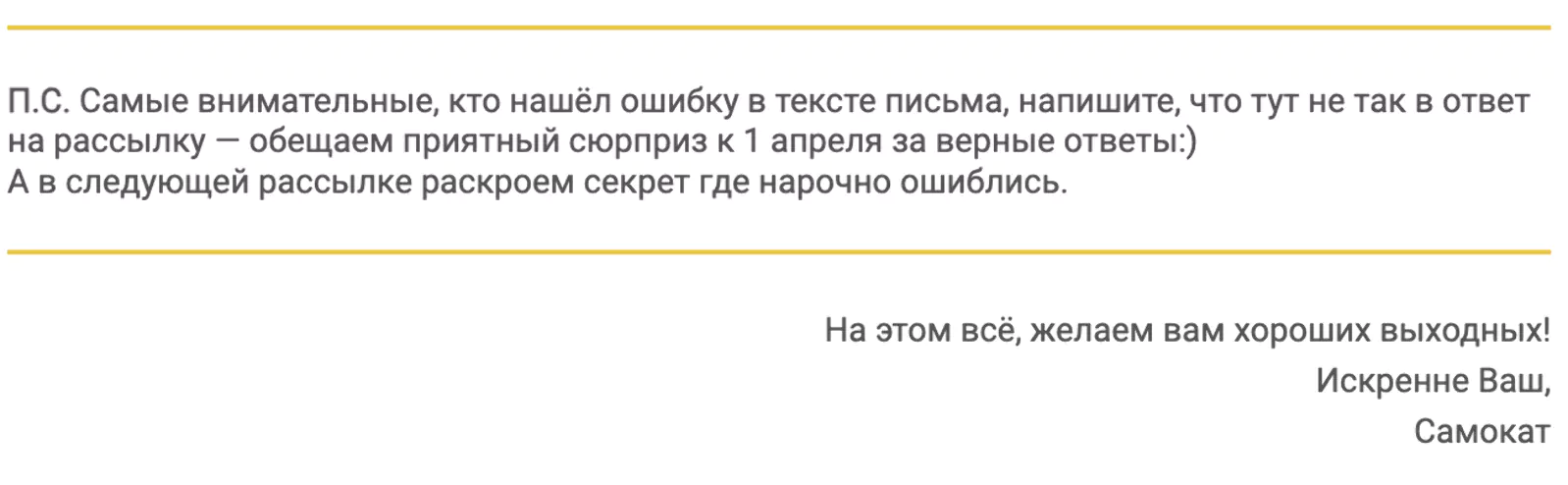 Отрывок из письма с темой «Найди ошибку в письме и получи подарок к 1 апреля»: open rate — 29,4%