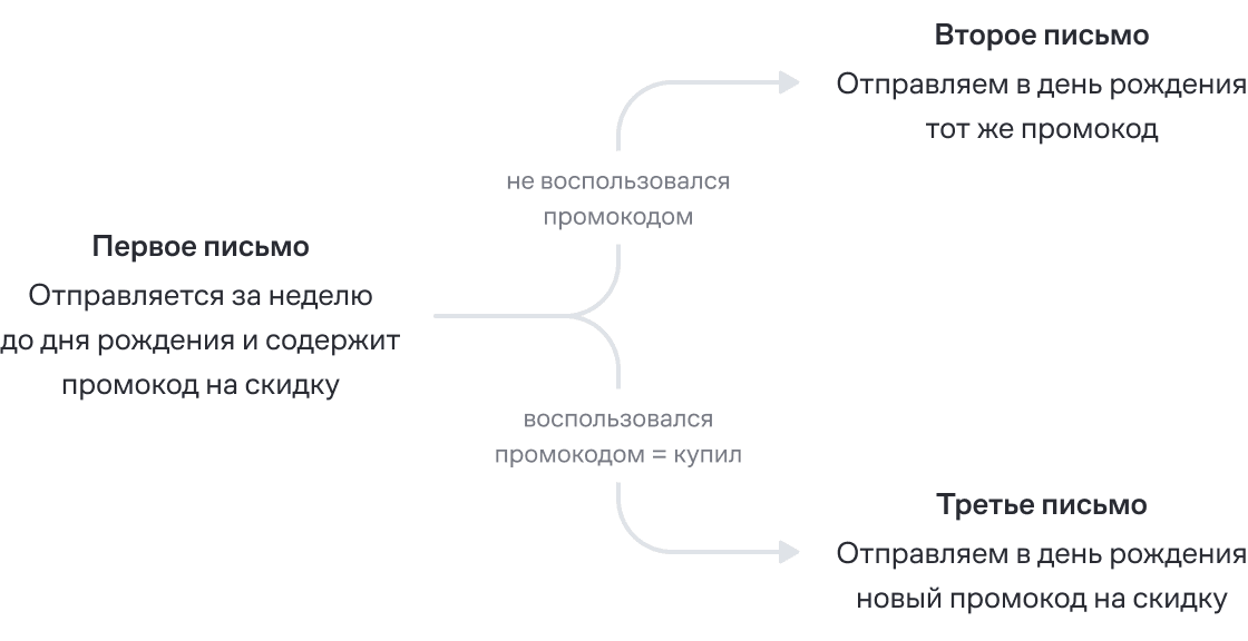 Цепочка реактивации — это серия автоматических сообщений, в которых клиенту предлагают скидку на заказ. Маркетинговая стратегия основана на постепенном стимулировании продаж — как правило, размер выгоды растет с каждым последующим письмом, если человек не покупает.