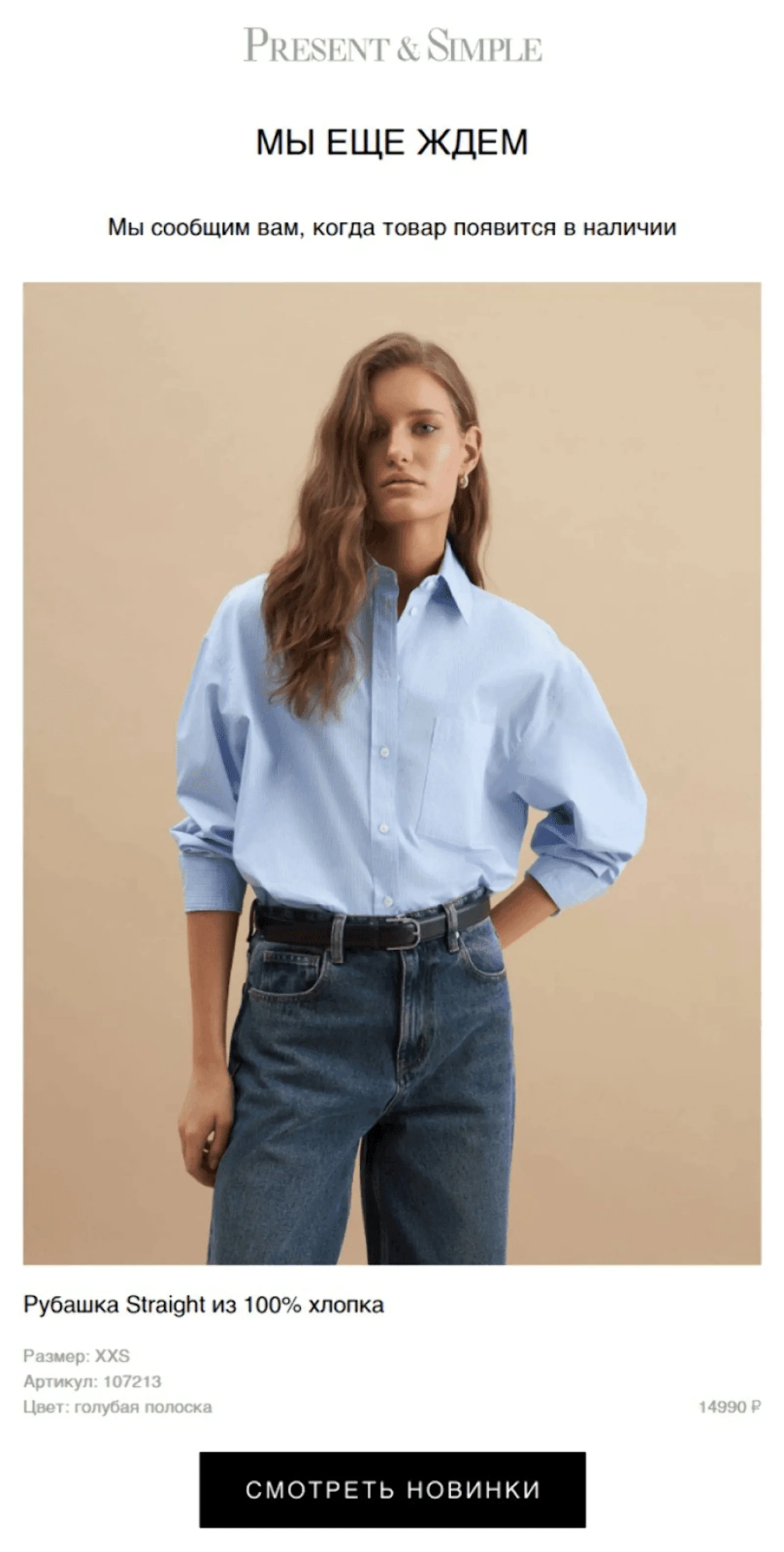 Бренду Present & Simple на стадии зрелости продукта нужно было удерживать клиентов. У компании работал сценарий back in stock: если товара не было, клиент мог подписаться на уведомление о поступлении. Проблема была в том, что ожидание часто затягивалось на недели, и пользователи обращались в поддержку с вопросами. Команда добавила в сценарий письмо «Ждем вместе». Если товар появился на складе, клиенту приходило уведомление на почту, а если нет — рассылка с напоминанием об ожидании товара и предложением изучить новинки. Это снизило нагрузку на поддержку и вернуло часть спроса за счет альтернатив.