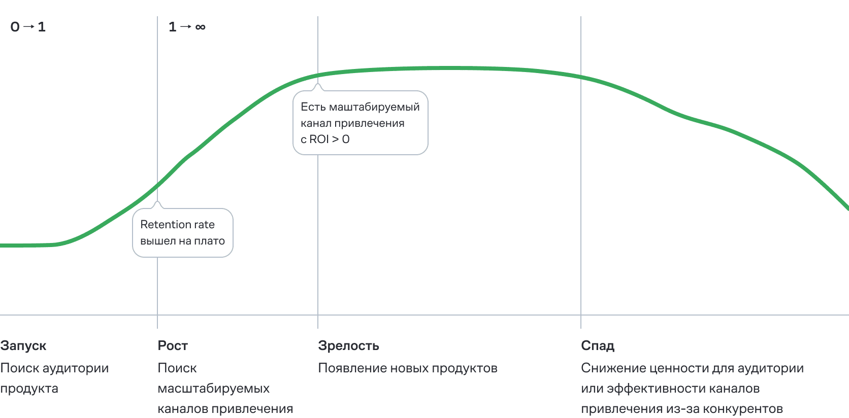 Продажи, активная база клиентов и retention rate на стадии запуска увеличиваются с нуля, на этапе роста — масштабируются, на стадии зрелости — стабилизируются, а затем постепенно снижаются