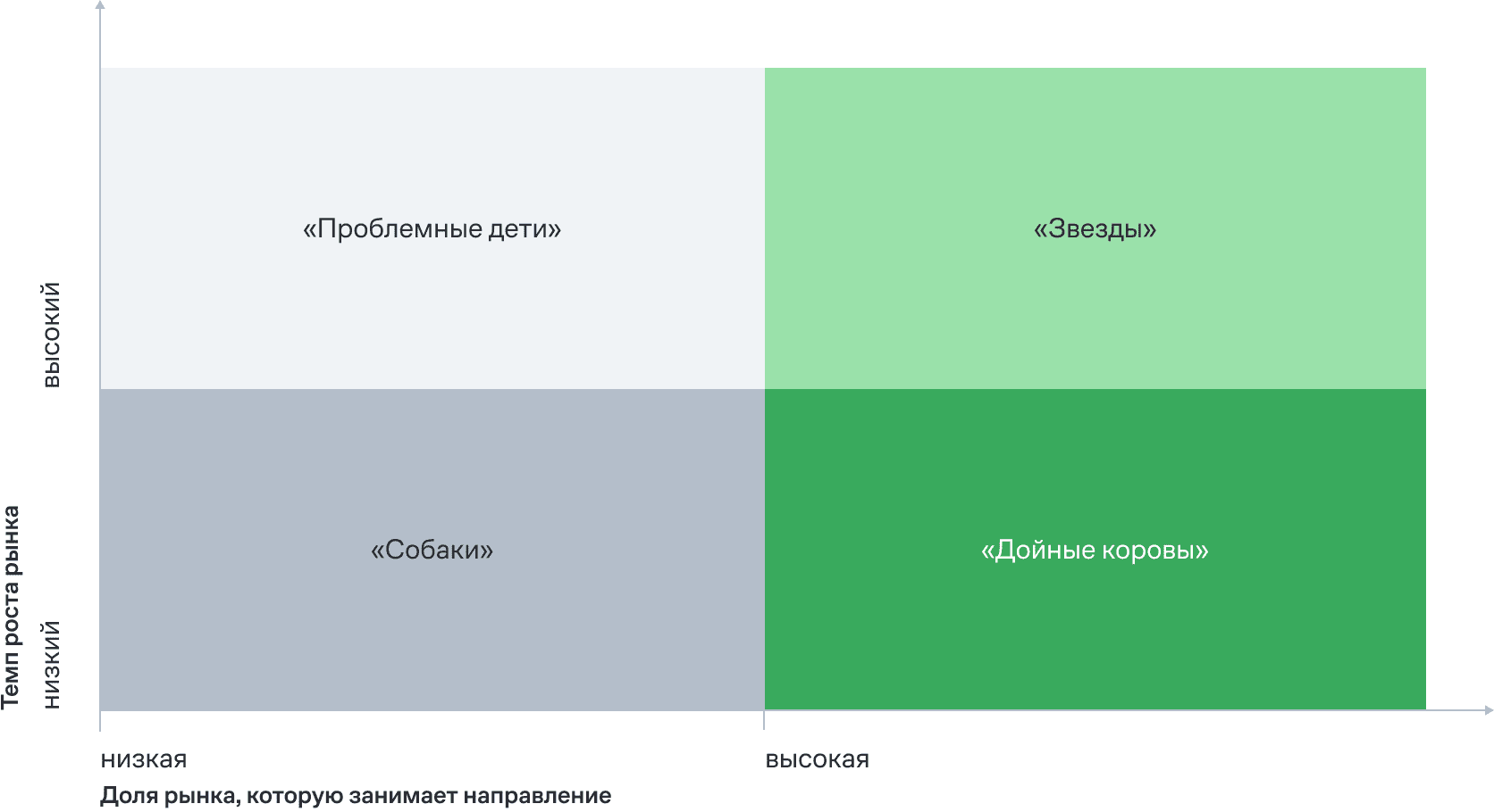 - «Проблемные дети» — проекты, которые не поспевают за рынком и нуждаются в серьезных вложениях.