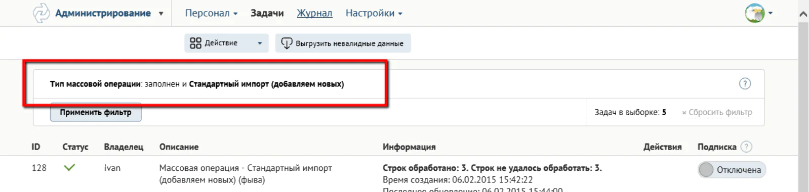 Допустим, я хочу подписаться на все события, связанные с импортом потребителей. Для этого в фильтре я выбираю тип массовой операции «Стандартный импорт (добавляем новых)»: