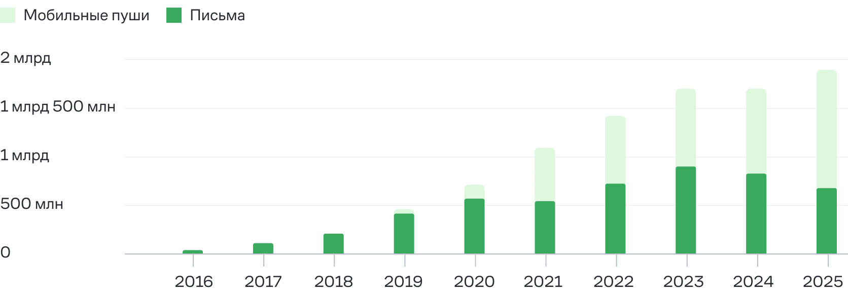 За неделю «черной пятницы» наши клиенты отправили 1,9 млрд мобильных пушей и писем — это на 12% больше, чем в 2025 году. Причем второй раз подряд мобильные пуши опережают письма по числу отправок.